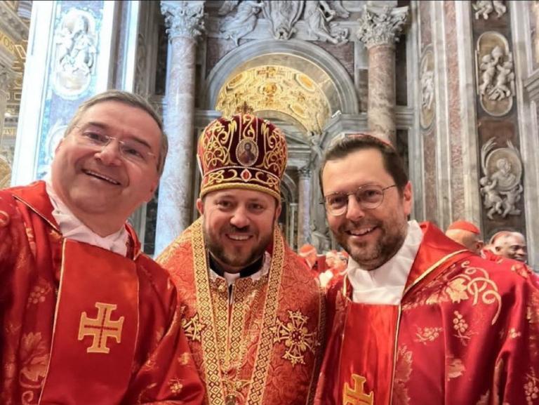 Portuguese Cardinal Américo Aguiar, 51, who led World Youth Day Lisbon, Cardinal Mykola Bychok, 45, a Ukrainian Greek Catholic bishop serving in Australia, and Italian Cardinal Giorgio Marengo, a 50-year-old missionary in Mongolia, are pictured in a selfie taken in St. Peter's Basilica on April 26, 2025, the day of Pope Francis' funeral. (OSV News photo/Facebook of Cardinal Américo Aguiar)