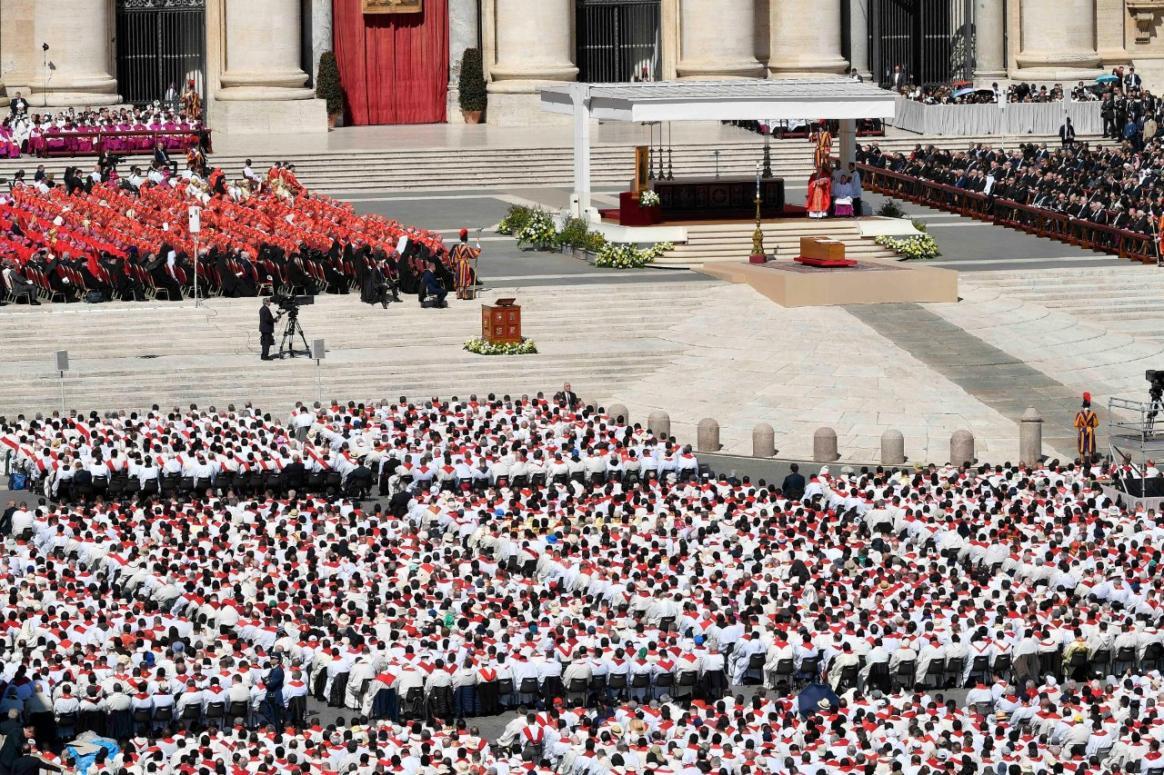 The late pope’s closed plain wooden coffin lay in front of the altar throughout the Mass.