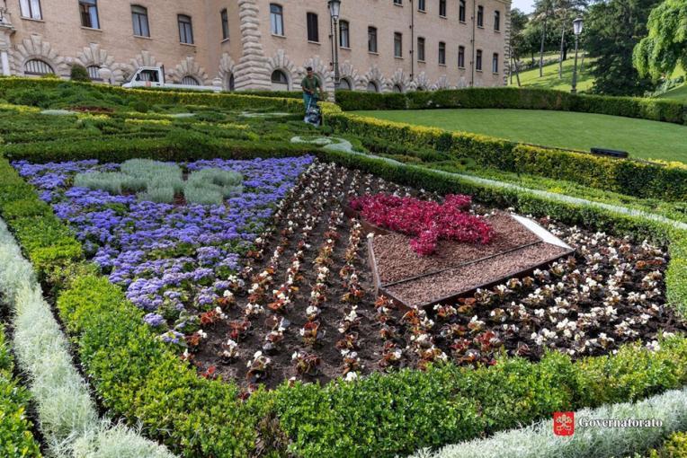 Visitors to the Vatican Gardens and those climbing to the top of St. Peter’s Basilica will be able to see the emblem created from hundreds of colored plants arranged like “tiles of a mosaic,” according to a May 28 press release by the governing office. They kept the same “frame” around the emblem, which does not change: a green tiara made up of dwarf boxwood; a gold key composed of a Euonymus Aureus whose foliage stays