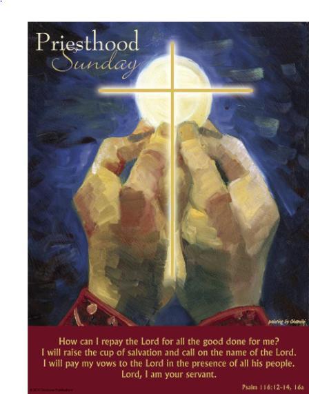 Gracious and loving God, we thank your for the gift of our priests. Through them, we experience your presence in the sacraments. Help our priests to be strong in their vocation.