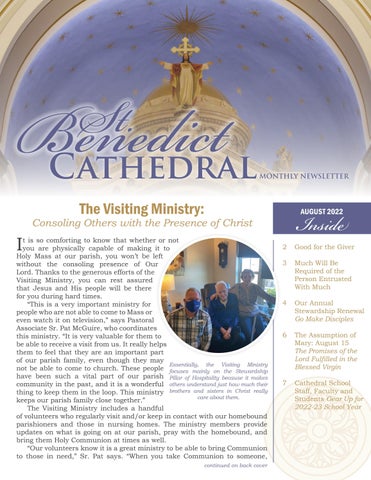 t is so comforting to know that whether or not you are physically capable of making it to Holy Mass at our parish, you won’t be left without the consoling presence of Our Lord. Thanks to the generous efforts of the Visiting Ministry, you can rest assured that Jesus and His people will be there for you during hard times. “This is a very important ministry for people who are not able to come to Mass or even watch it on television,” says Pastoral Associate Sr. Pat McGuire, who coordinates this ministry. “It is very valuable for them to be able to receive a visit from us. It really helps them to feel that they are an important part of our parish family, even though they may Essentially, the Visiting Ministry not be able to come to church. These people focuses mainly on the Stewardship have been such a vital part of our parish Pillar of Hospitality because it makes community in the past, and it is a wonderful others understand just how much their thing to keep them in the loop. This ministry brothers and sisters in Christ really care about them. keeps our parish family close together.” The Visiting Ministry includes a handful of volunteers who regularly visit and/or keep in contact with our homebound parishioners and those in nursing homes. The ministry members provide updates on what is going on at our parish, pray with the homebound, and bring them Holy Communion at times as well. “Our volunteers know it is a great ministry to be able to bring Communion to those in need,” Sr. Pat says. “When you take Communion to someone, continued on back cover