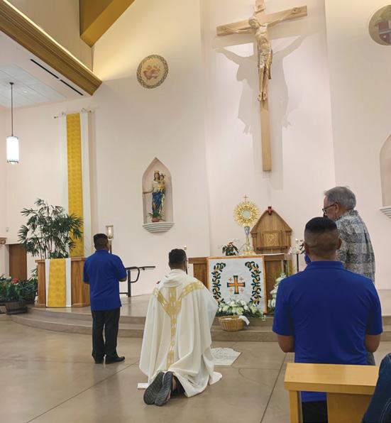 At St. Michael, we marked the beginning of the revival with a short procession to the front portico at the end of each Mass for the Benediction of the Blessed Sacrament to the assembly and to the Vil lage of Kailua-Kona. With this gesture, we hope to emphasize our mission of becoming empowered by the Eucharist to bring Jesus to all we encoun ter as we work to build the Kingdom of God right here in our midst. A large new monstrance that was brought from the Basilica of Our Lady of Guada lupe in Mexico City was dedicated for this occa sion. This prominent ostensorium makes it easier for anyone sitting anywhere in the church to have a better view of the Holy Eucharist during adoration while providing a dignified way of exposing the Blessed Sacrament in our voluminous sanctuary.