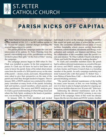 t. Peter Parish in Lincoln kicked off a capital campaign the weekend of Oct. 1-2 — an $8.5 million update to the 32-year-old campus, external changes matching the renewal happening at the parish. The parish placed the campaign under the care and intercession of its patron, St. Peter. Flowing from the parish’s stewardship way of life, parishioners are being invited to place their gifts “At the Feet of Peter” during the campaign. The campaign process began in 2020 when Fr. Eric Clark was installed as pastor. In his first assignment as pastor, Fr. Clark says he knew he had to first listen and come to know his parish. Some of his initial observations came from the results of a 2019 parish survey on the state of the parish — desires, needs, and wants. All parishioners were asked to give their perspective on the state of the parish and what they thought needed to happen. Then in January 2021, a SWOT analysis was conducted by a thirdparty consultant at many levels of the parish, including staff and teachers, council members, school parents, and other parishioners. The survey and SWOT analysis gave Fr. Clark a good understanding of where things stood and where the Holy Spirit, working in the hearts of parishioners, was inviting the parish to go. In January 2021, Fr. Clark identified and invited