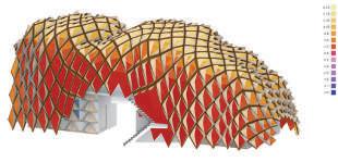 400 The shading pane a e p o uded ou wa ds The main ac o are: 1. di ec on o the no mal o plane 2 di e The esult is the The we g no h So o o th pa they are more CONVEX CONVEX OF THE PANELS DIRETIONS PANEL’S NORMAL VECTOR WINTER SOLSTICE NOON SUN DIRECTION WEIGHTED VERAGE DIRECTION SUNLIGHT HOURS The open enth o pane ar es by he sunl gh hou s o w nter o ce On the oo op the s ucture re ev mos sun gh so the ape tu e is the owe On the othe hand the s de pa opens w de The opening p opo on va es om 0.1~0.8. (0 ind ca e o al y open 1means o al y c o ed) APERTURE OF THE PANELS SUNLIGHT HOURS APERTURE OPEN LENTH