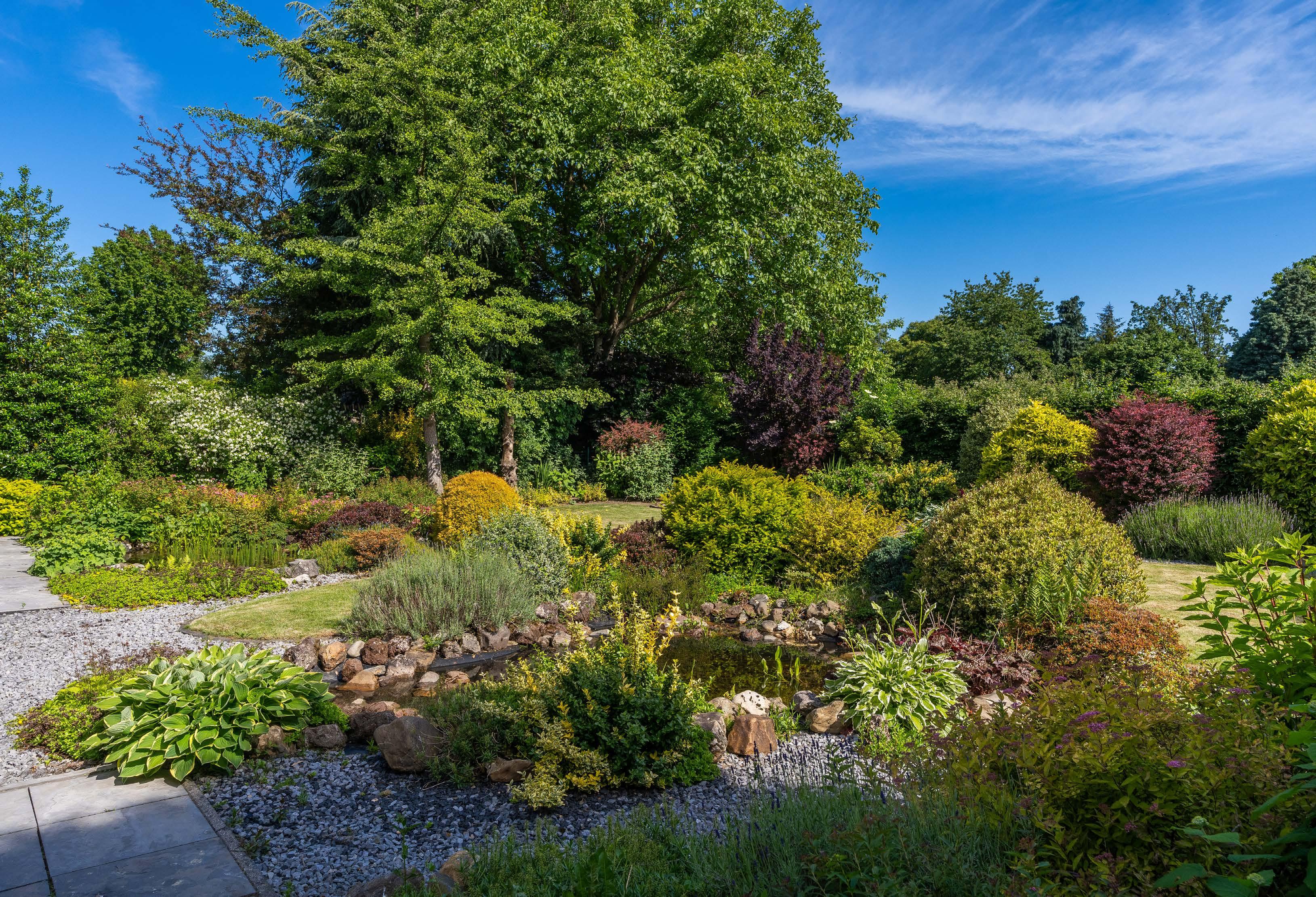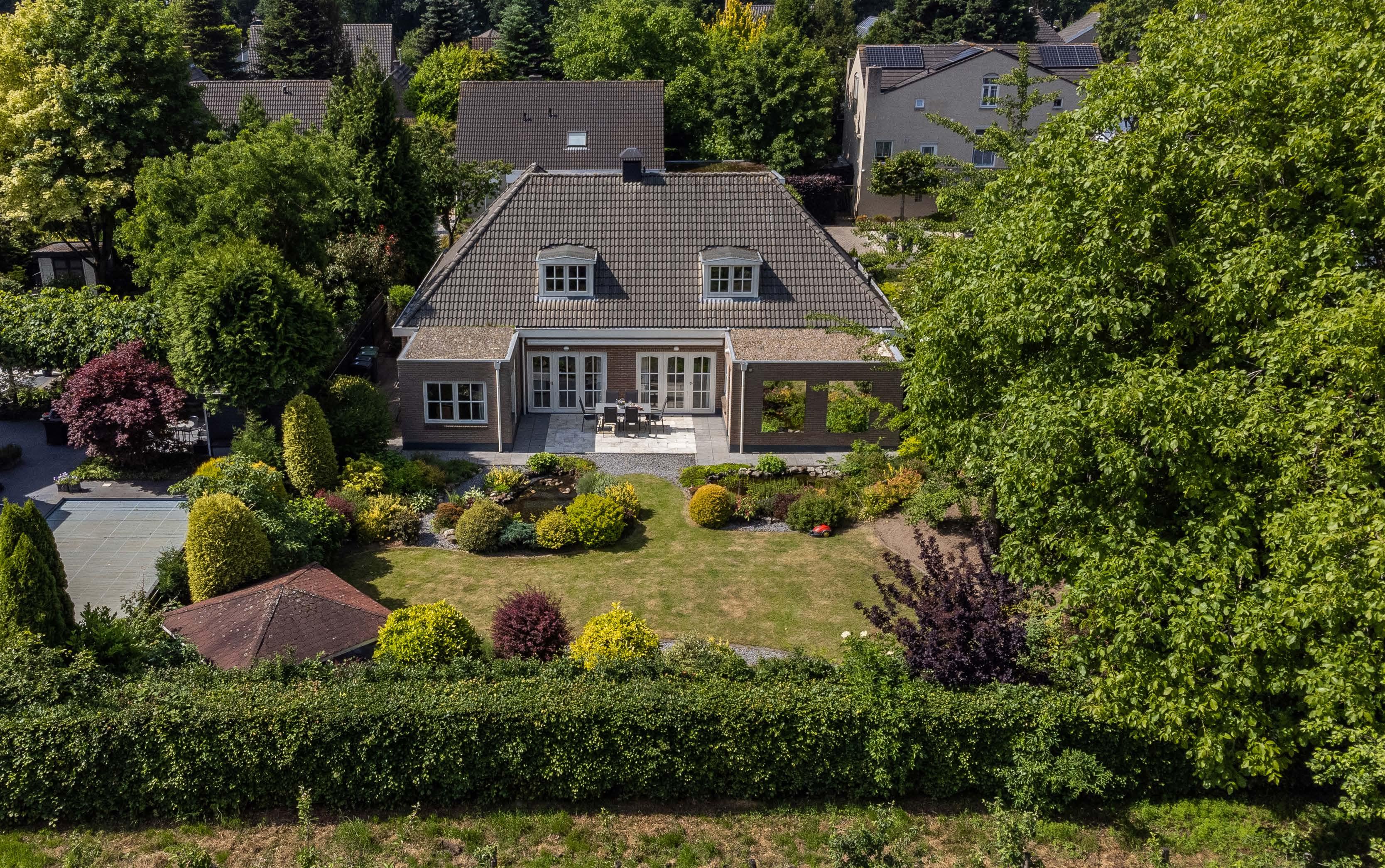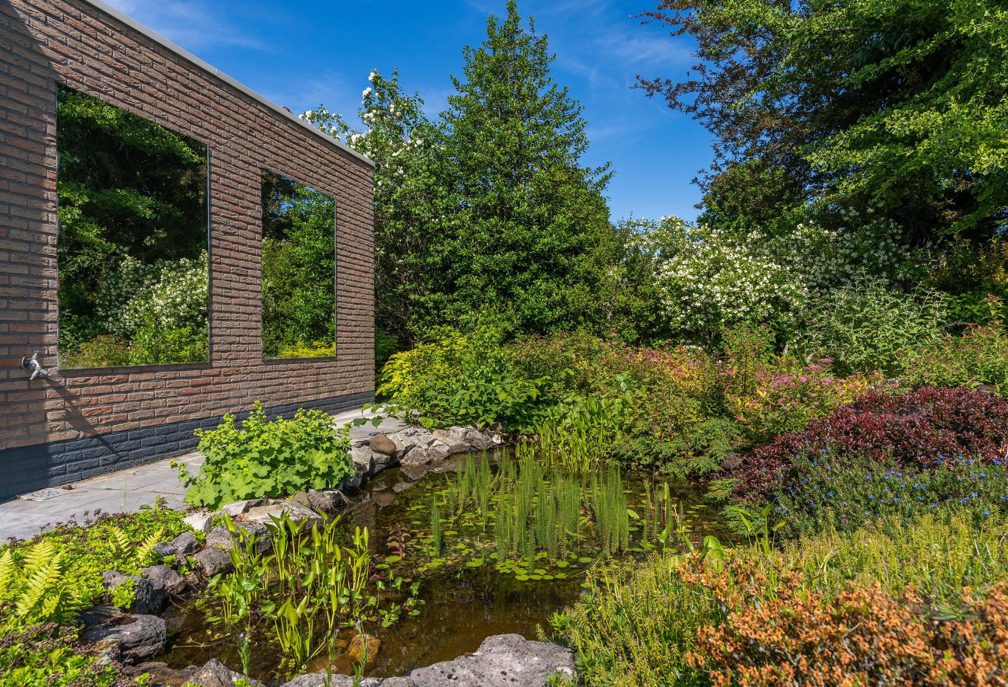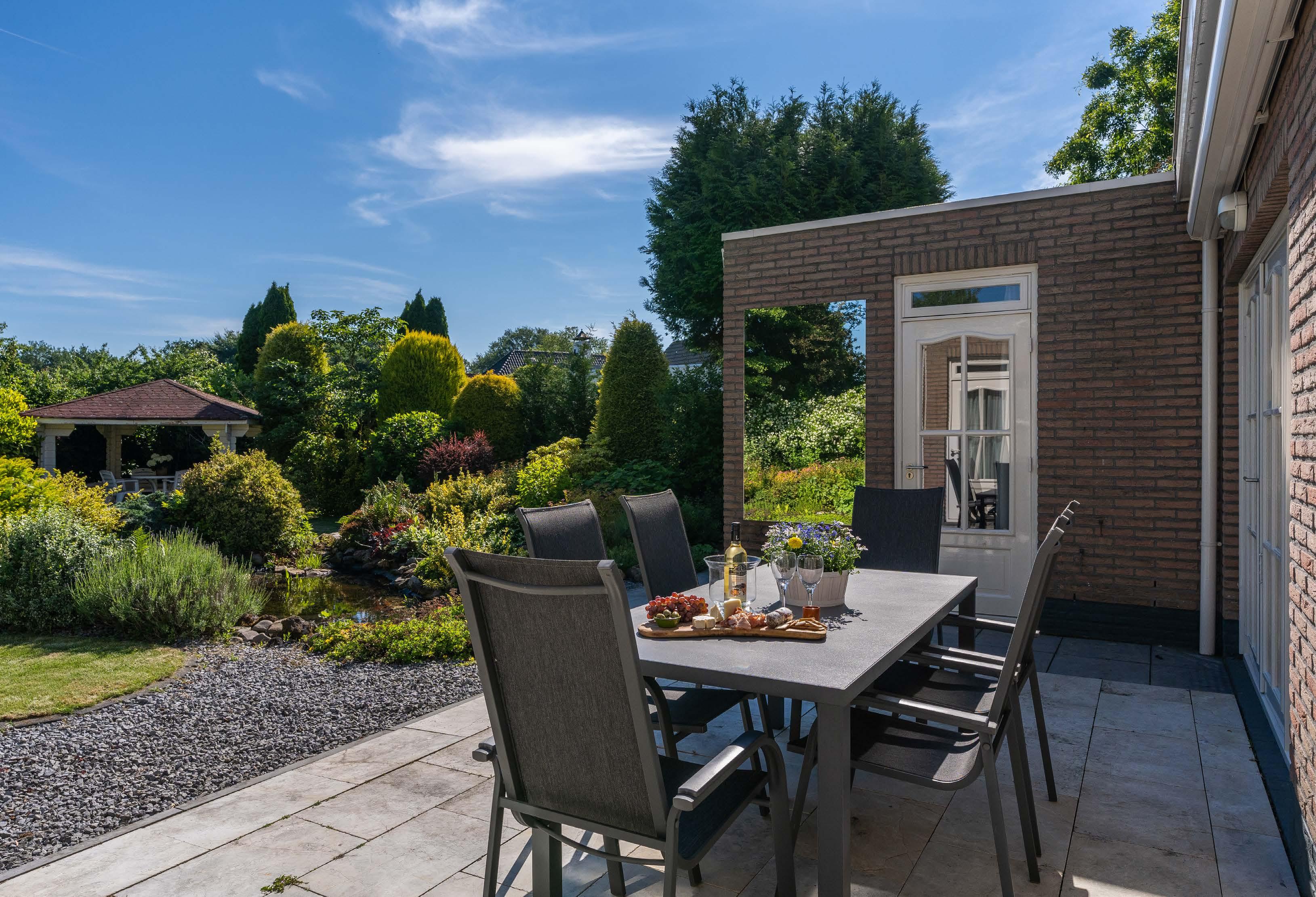 Door de tuin met twee vijverpartijen meandert een wandelpad. Rechts achterin komt het uit bij een open prieel dat fijn is als over kapt zit- of eetterras. Door de omheining en begroeiing zijn de tuin en boomgaard van restaurant De Luytervelde te zien. Daar is het uitzicht aan de achterzijde volkomen vrij, zonder zichtbare bebou wing. Het geheel wordt omringd door volwassen beplanting en statige bomen, ook bij de buren aan weerszijden.