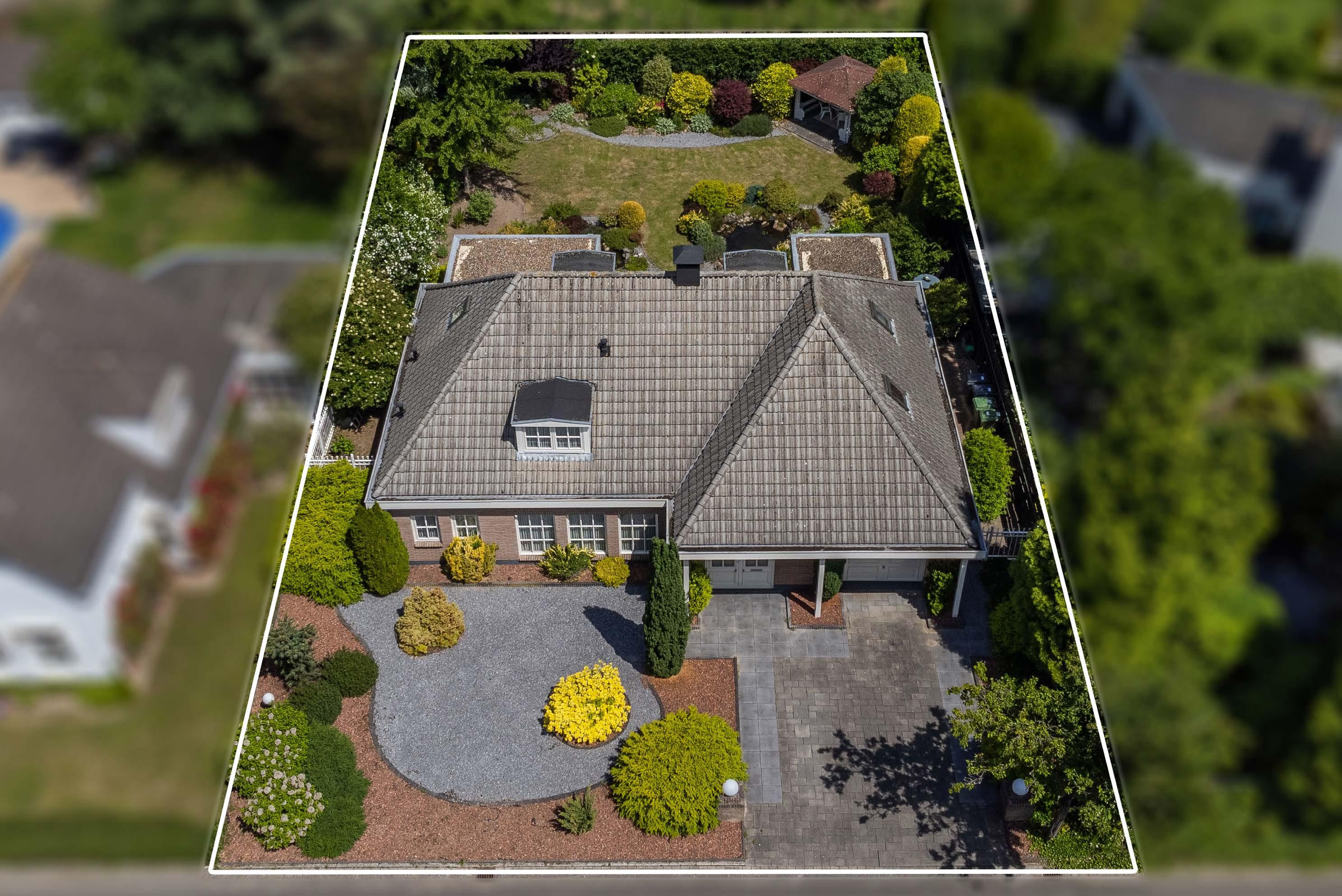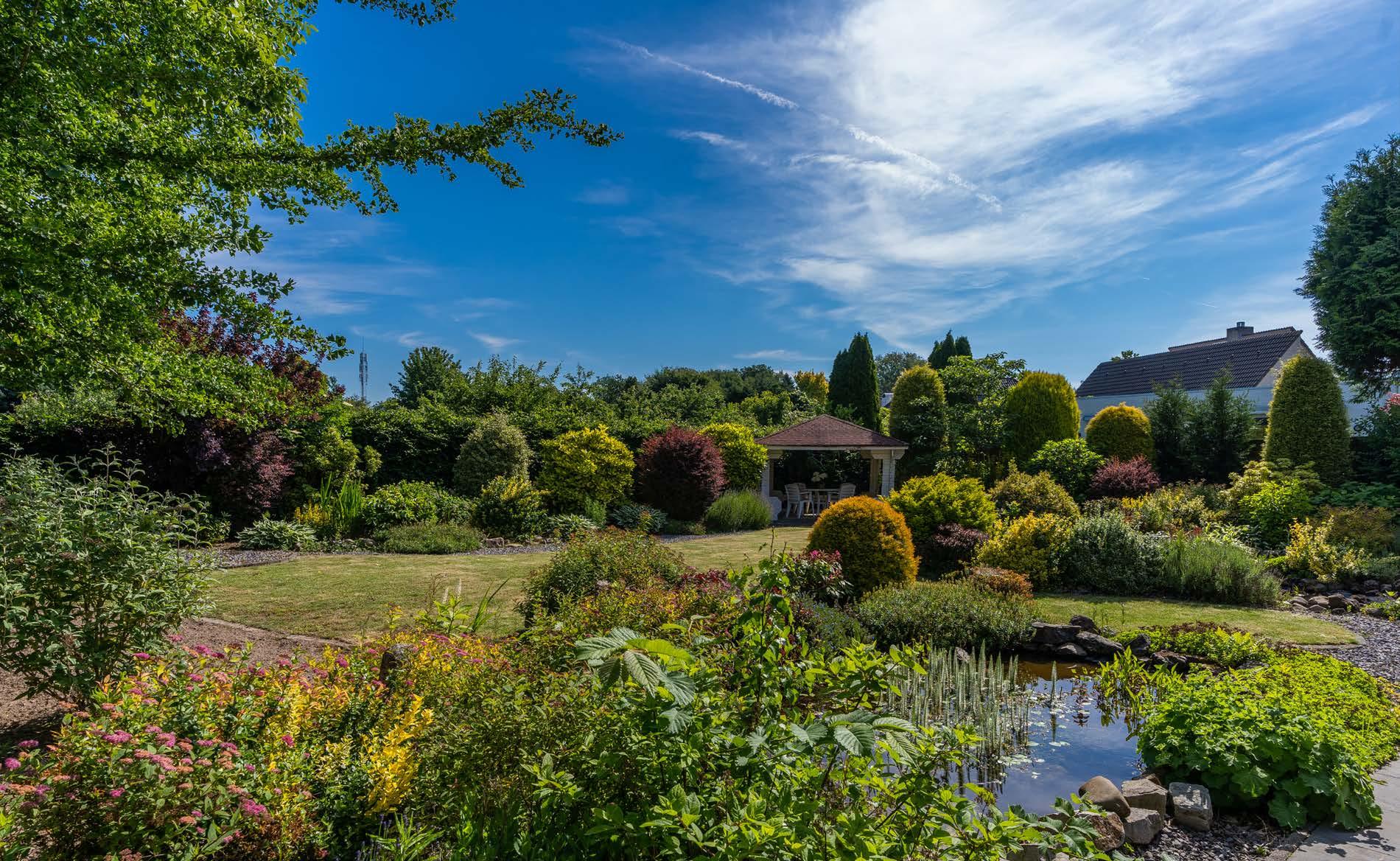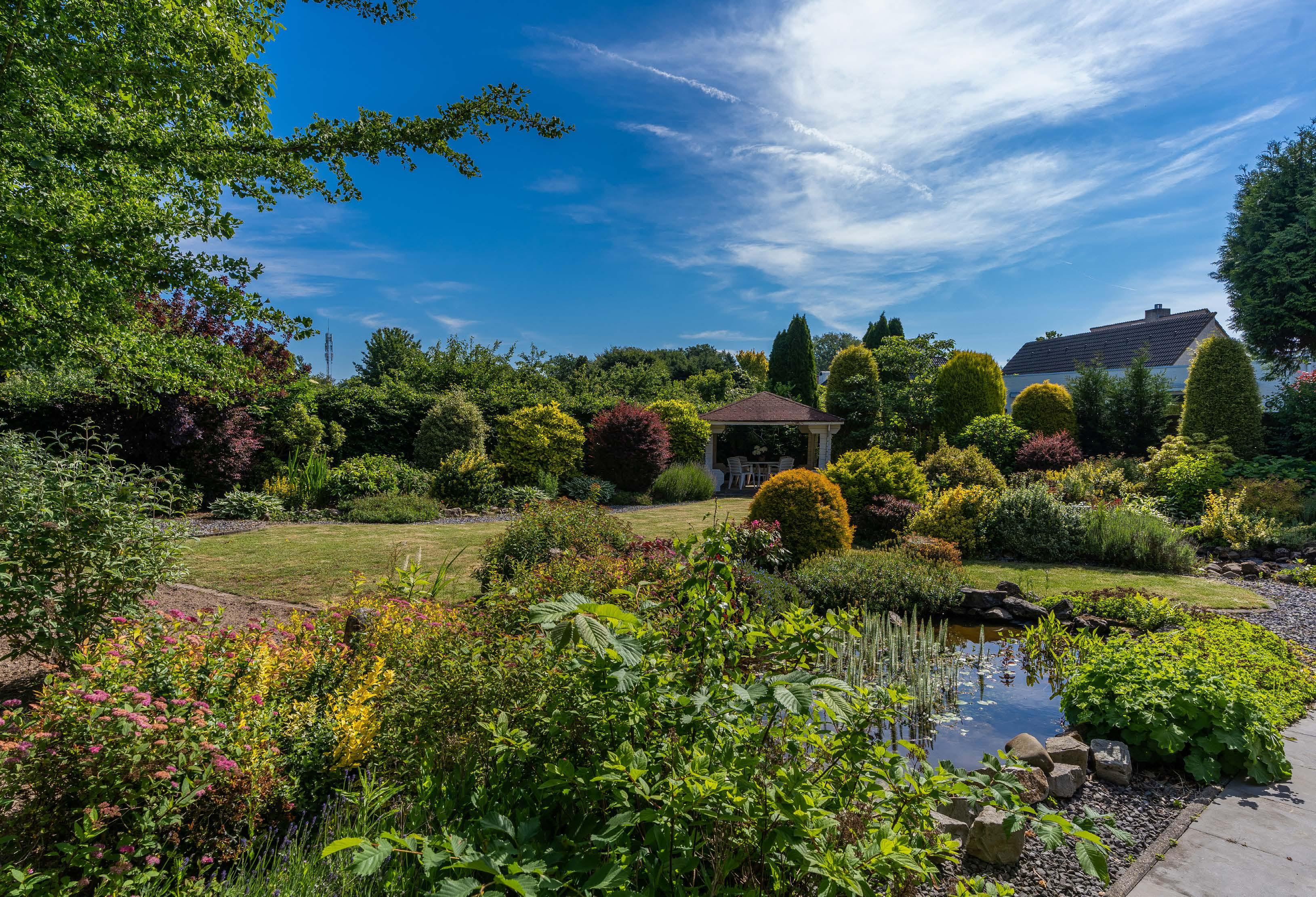 A footpath meanders through the garden with two ponds. To the right at the back, it leads to an open arbour that is fine as a covered sitting or dining terrace. The garden and orchard of De Luytervelde restaurant can be seen through the fencing and overgrowth. The re, the view to the rear is completely unobstructed, without any visible buildings. The whole is surrounded by mature planting and stately trees, including those of the neighbours on either side.