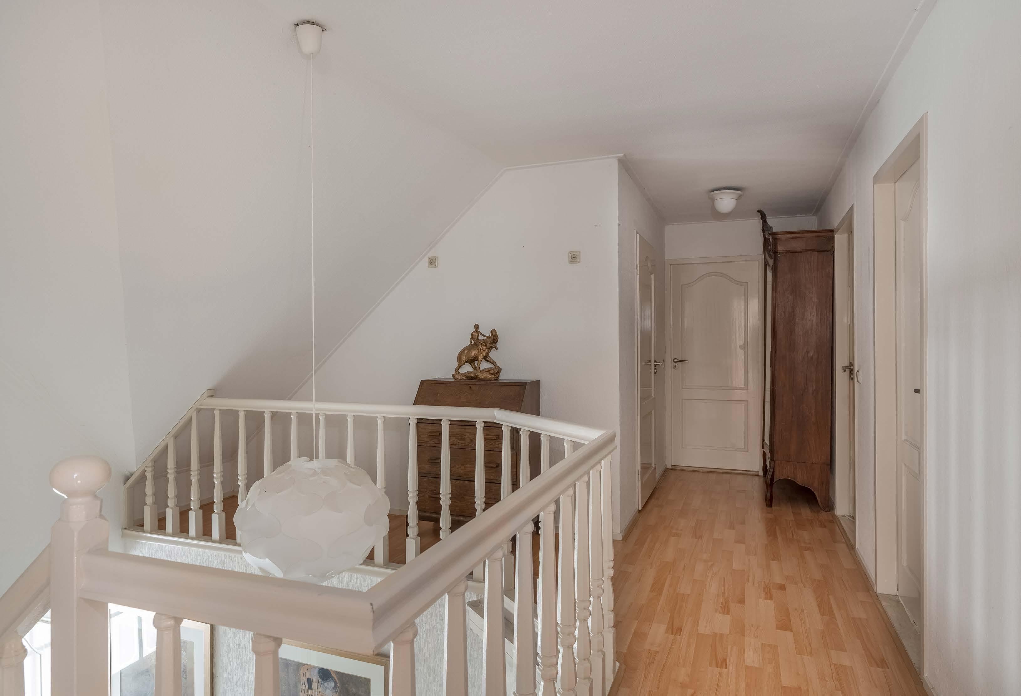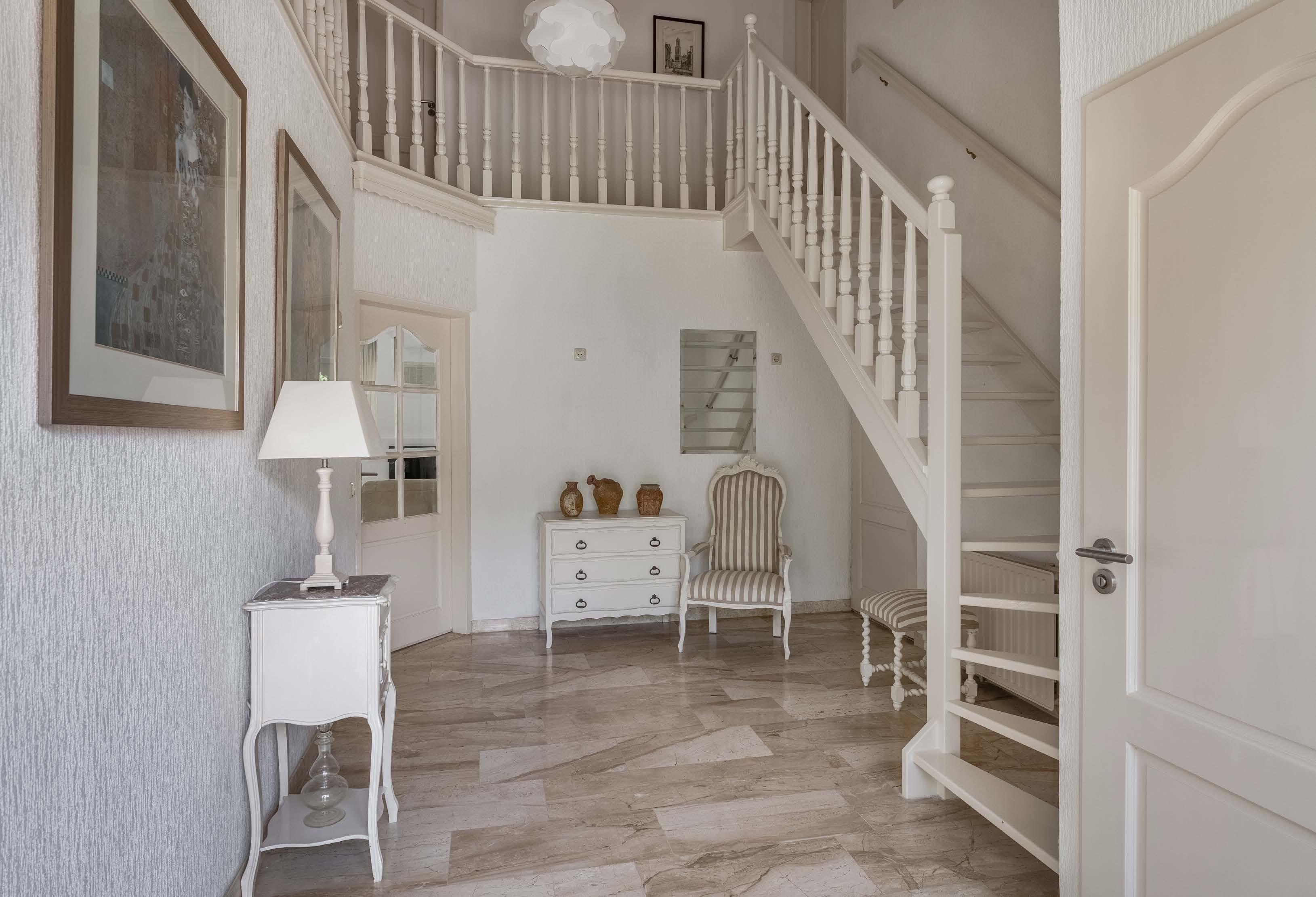 De witte houten open trap heeft bijpassende balustrade rond de fraaie vide met puntnok in de ontvangsthal.