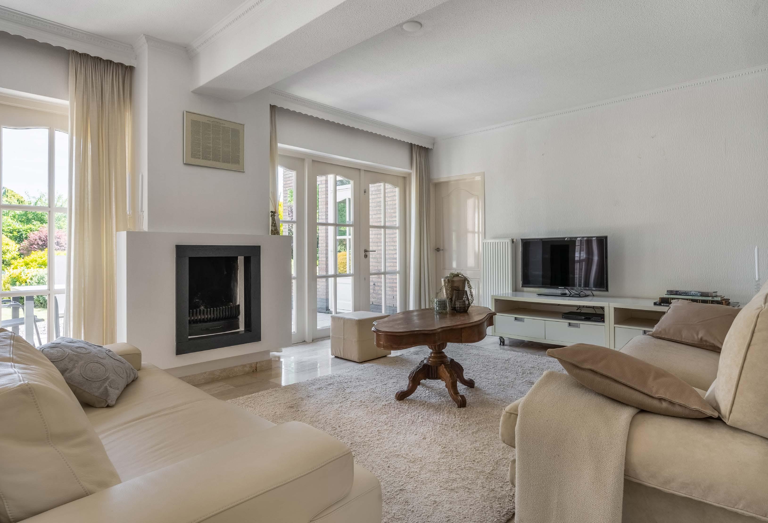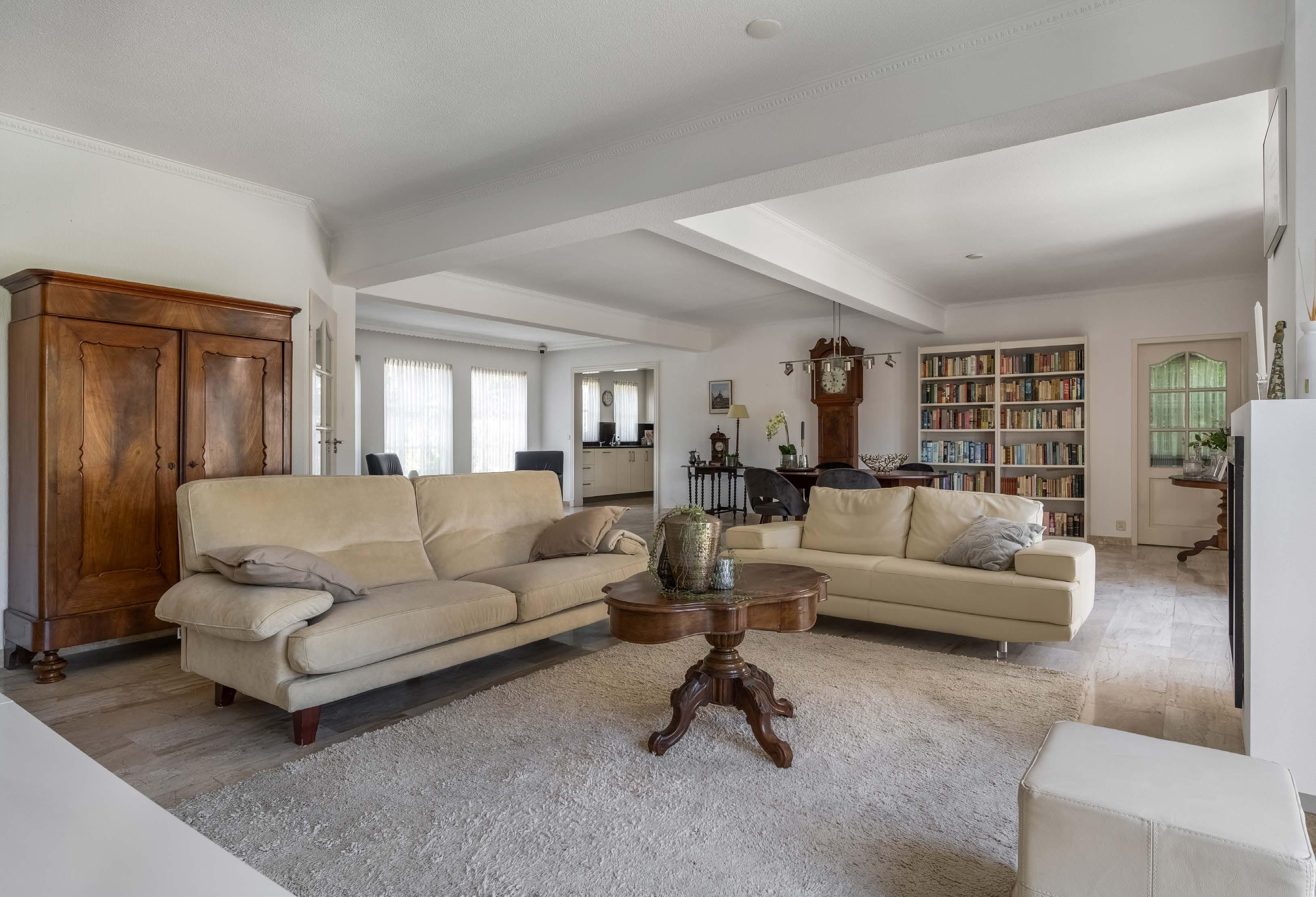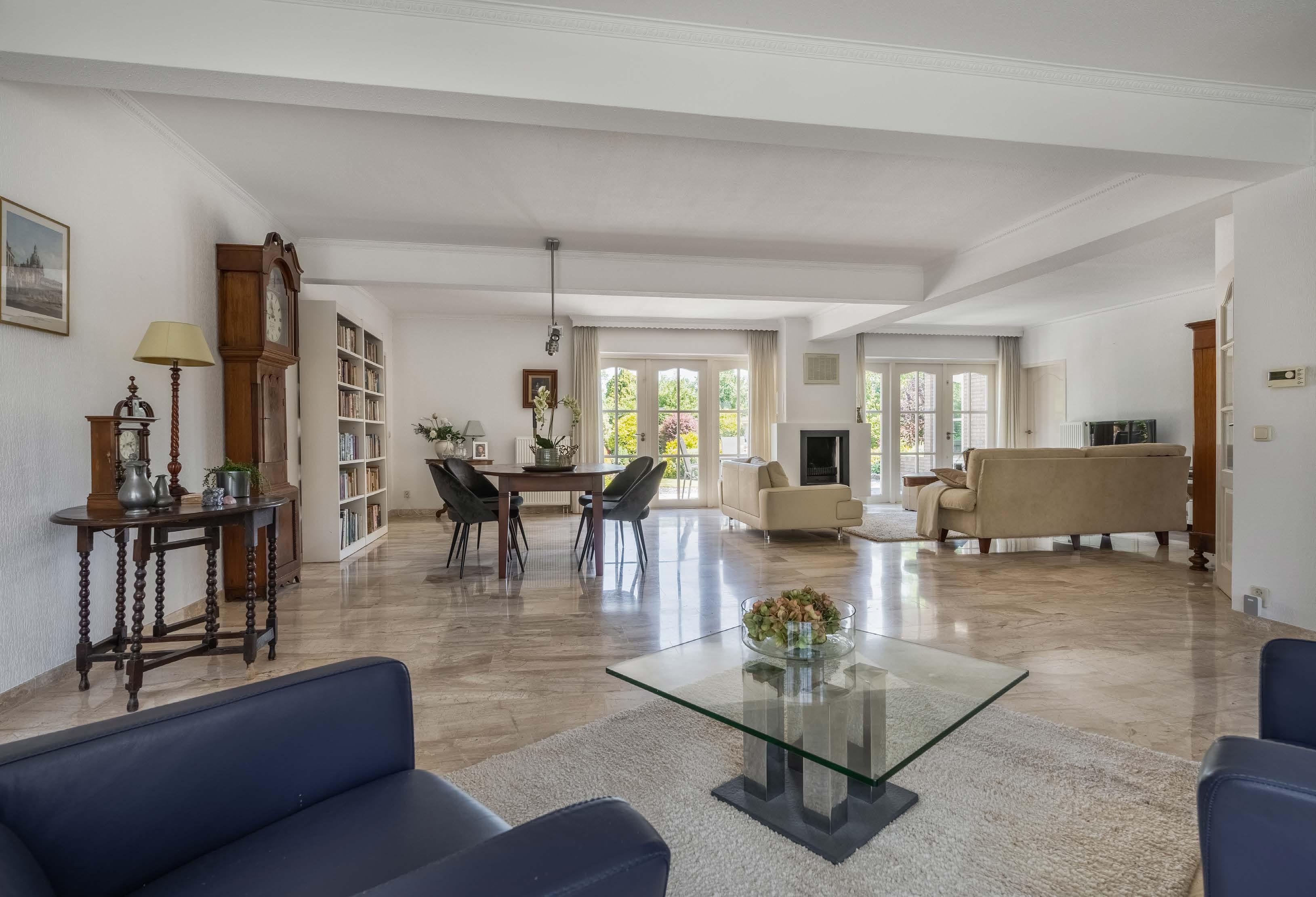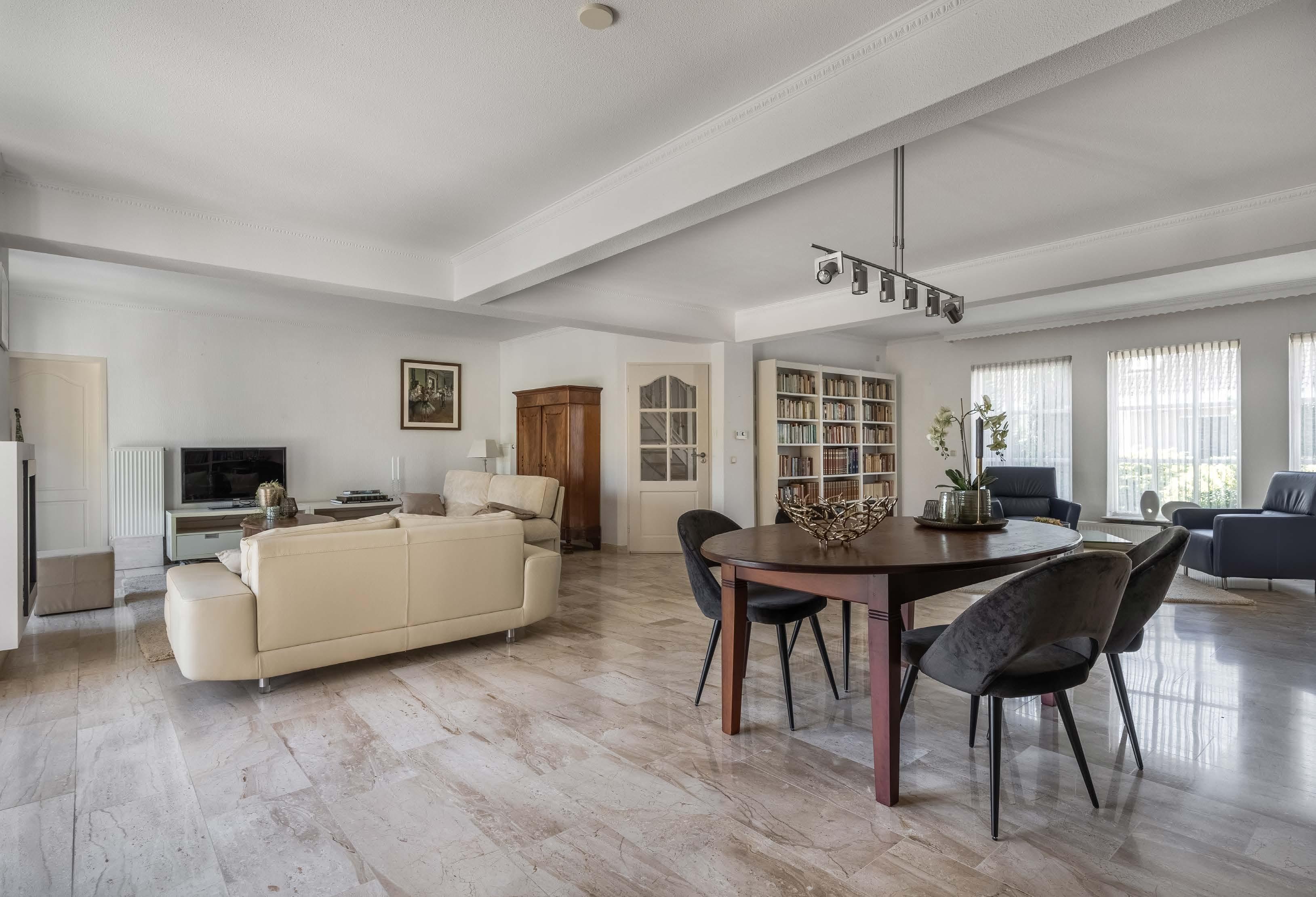 De bijzonder grote en lichte woonkamer heeft volop daglicht, dat de lichte, natuurlijke tinten tot hun recht laat komen. Tussen de twee dubbele tuindeuren naar het beschutte terras, is de strakke open houthaard met natuurstenen omlijsting gesitueerd. De groot se woon- en eetkamer heeft een lichte en klassieke uitstraling, dankzij de toepassing van natuursteen, marmer en de sierlijsten op het plafond.