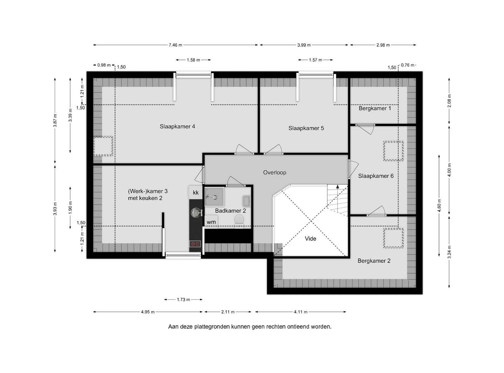 Vloerafwerking: laminaat Wandafwerking: deels behang, deels pleisterwerk Plafondafwerking: deels stucwerk, deels kunststof schroten (Werk)kamer 3 met keuken 2: circa 20 m² Slaapkamer 4: circa 28 m² Slaapkamer 5: circa 14 m² Slaapkamer 6: circa 12 m² Badkamer 2: circa 4 m² Garderobe- of bergkamer 1: circa 6 m² Bergkamer 2: circa 14 m²