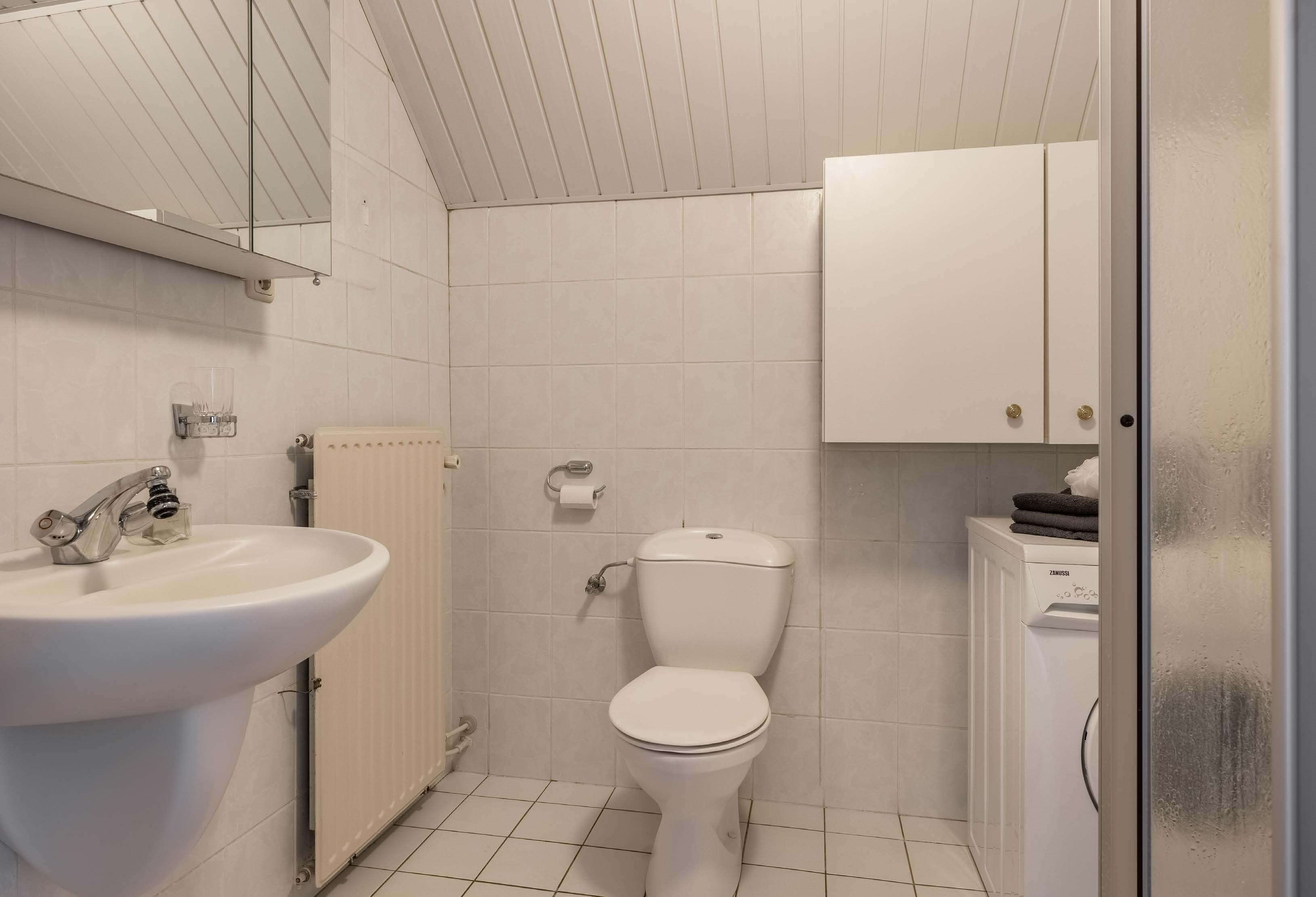 Badkamer 2 is toegankelijk vanaf de overloop. De badkamer heeft een kunststof douchecabine, 3e toilet, wastafel en een 2e aanslui ting wasmachine.