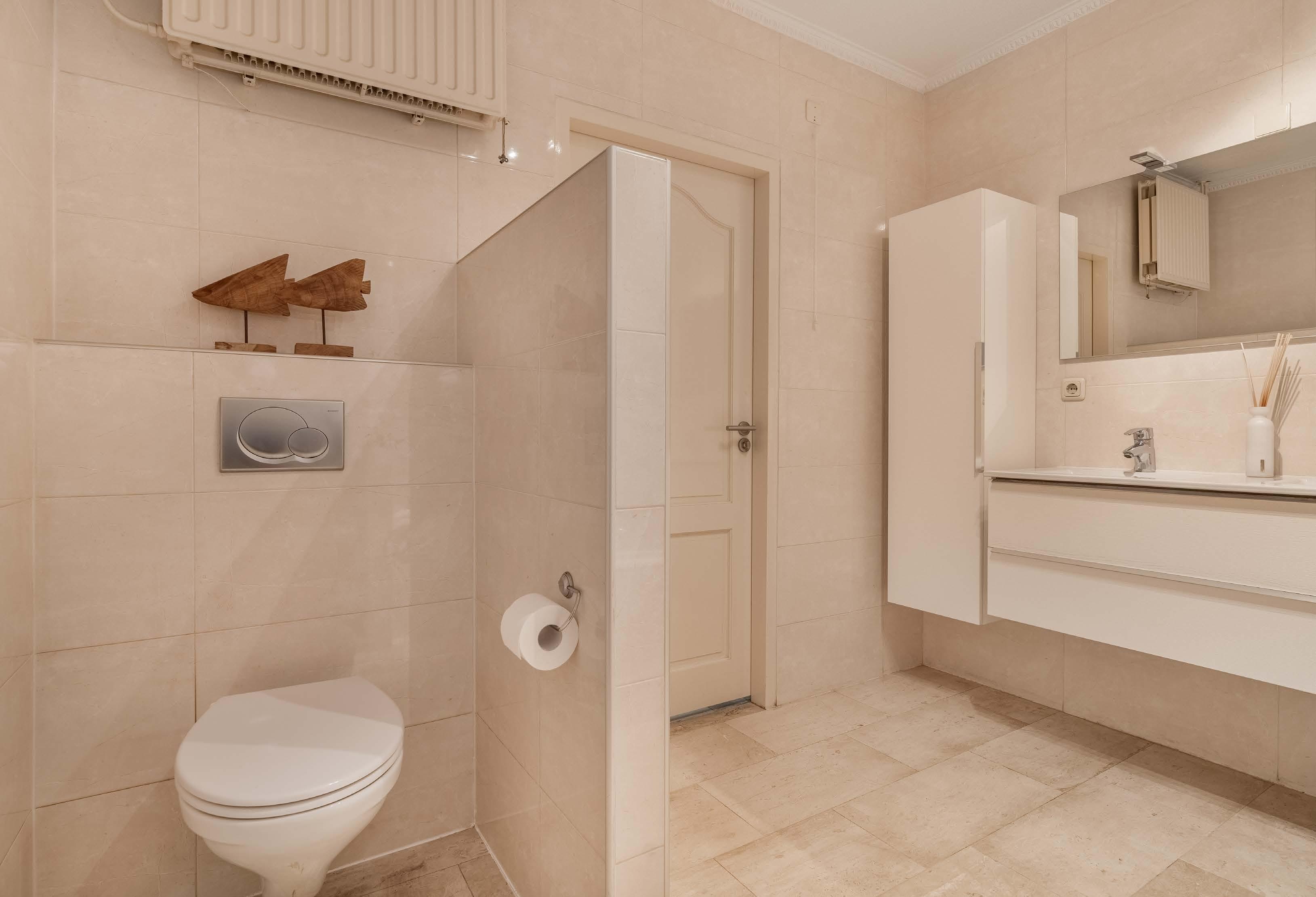 Badkamer 1 ligt aan de andere zijde van de tussenhal. Deze is volle dig uitgerust met een ligbad met thermostaatkraan, dubbele was tafel op wandmeubel met lades en kast, afgeschermd Villeroy & Boch zwevend toilet en een inloopdouche met thermostaatkraan.