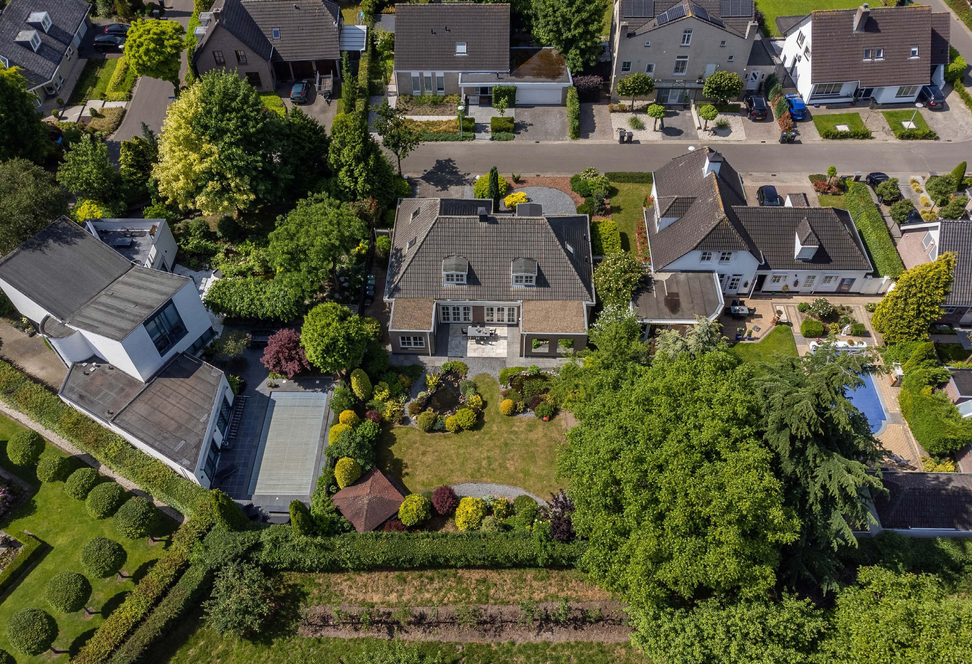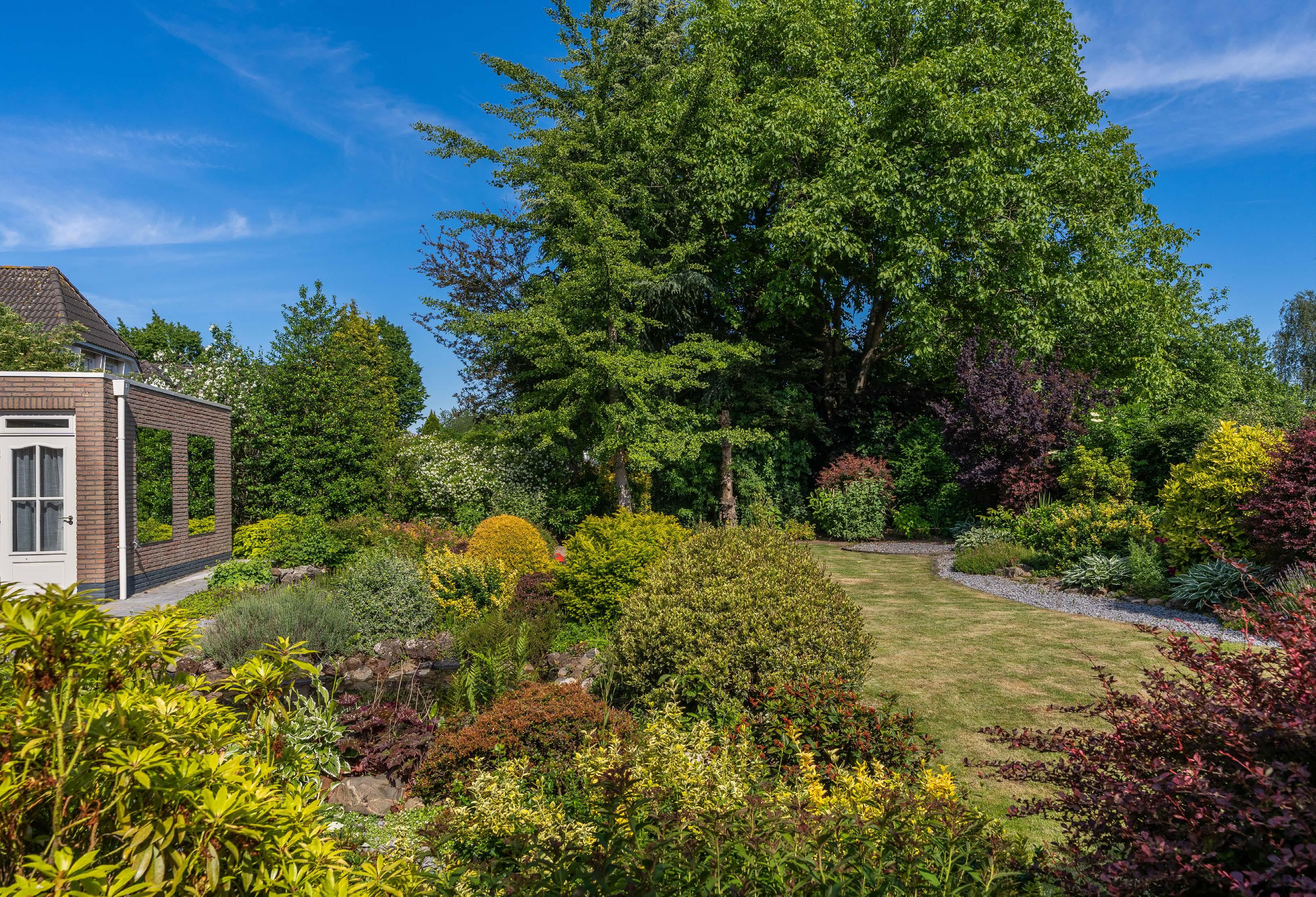 Achter is de volle breedte van het ruime perceel benut voor een fraaie en rustige achtertuin met oriëntatie op het oosten, voor de hele ochtend zon.