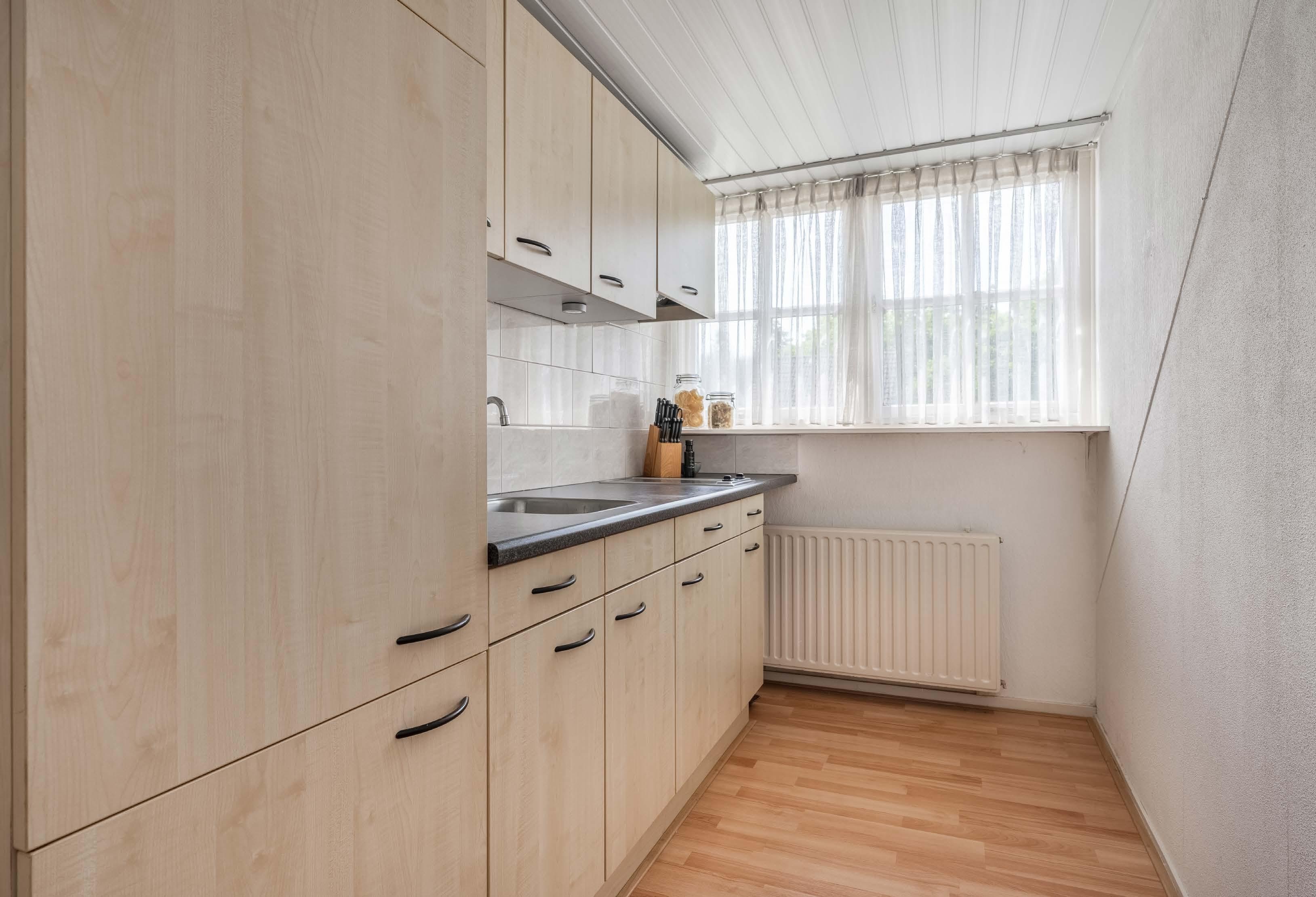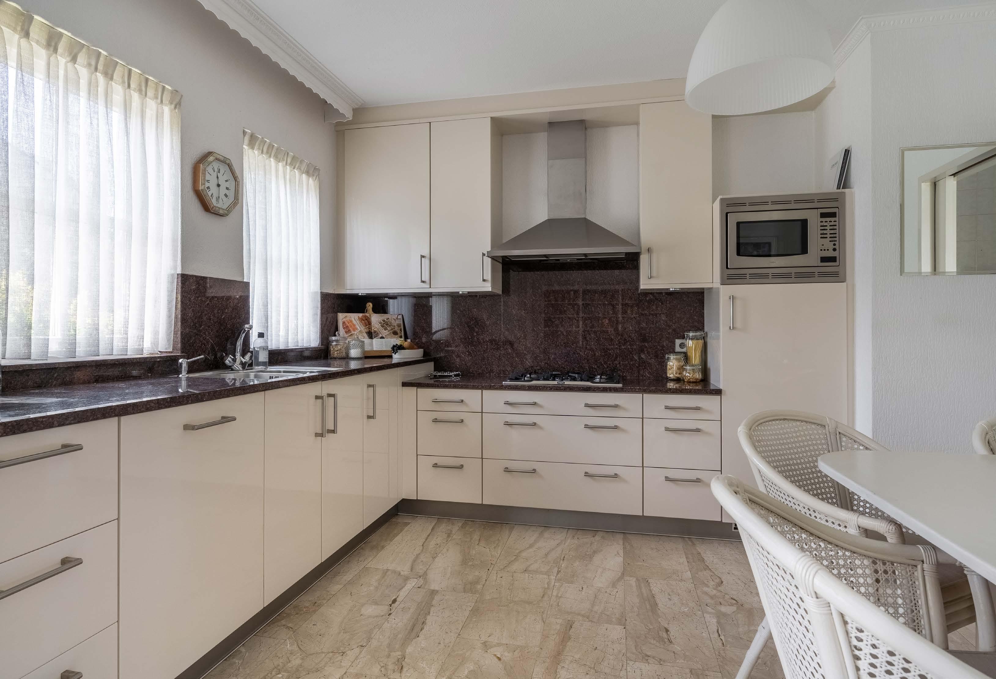 De keuken in L-opstelling met natuurstenen werkblad heeft twee ramen boven het aanrecht, met ertussen de anderhalve spoel bak. In de hoek is plaats voor een grote koelkast. In het werkblad ernaast is de vijfpits kookplaat, met erboven de rvs-afzuiging. Dit kookgedeelte is op ergonomische hoogte.