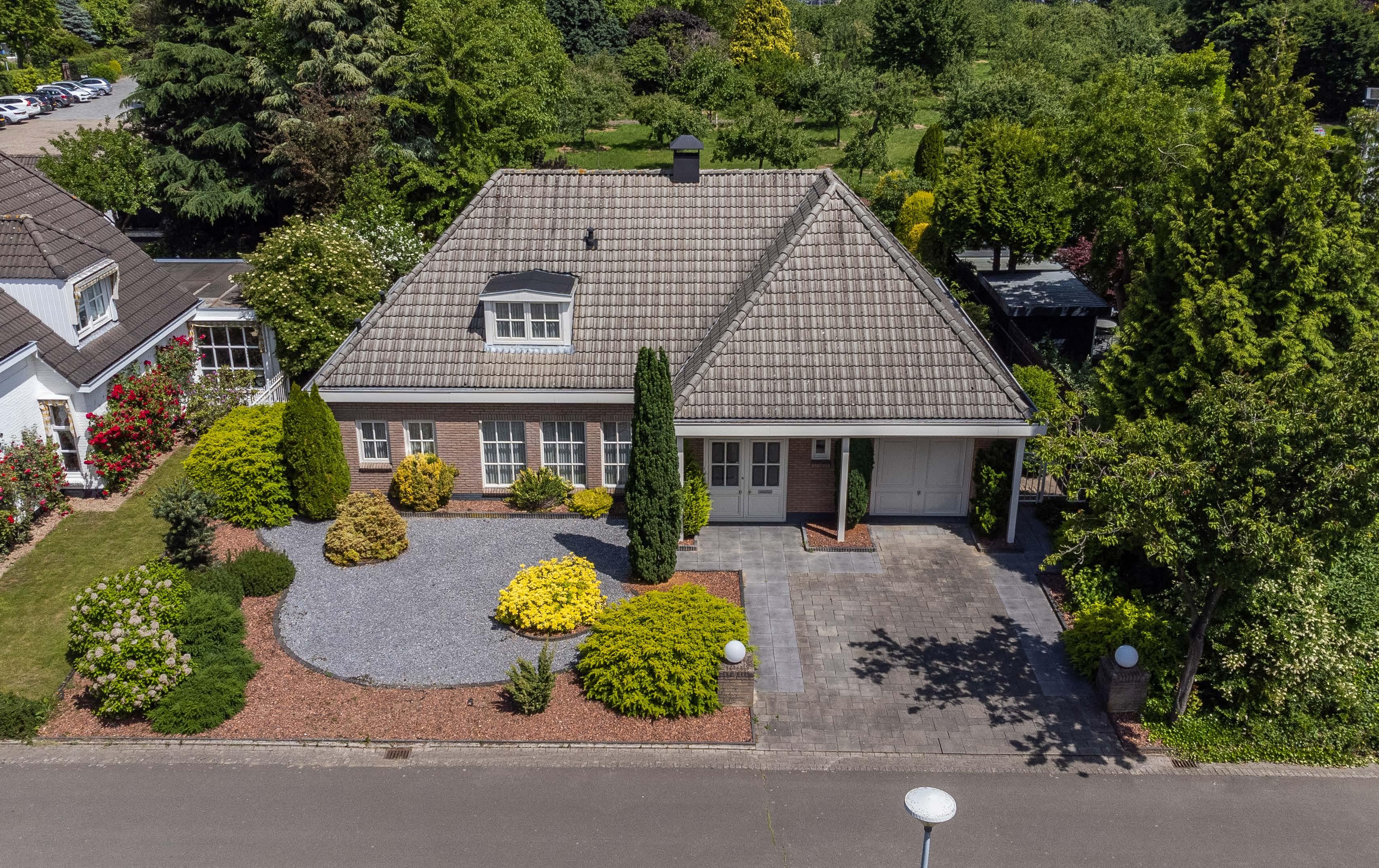 Aan weerszijden van de brede oprit naar de garage en voordeur is de tuin strak aangelegd en onderhouden, met gazon en gevarieer de en volwassen begroeiing in sierlijke perken. Een smal plantsoen scheidt de tuin van de rustige weg.