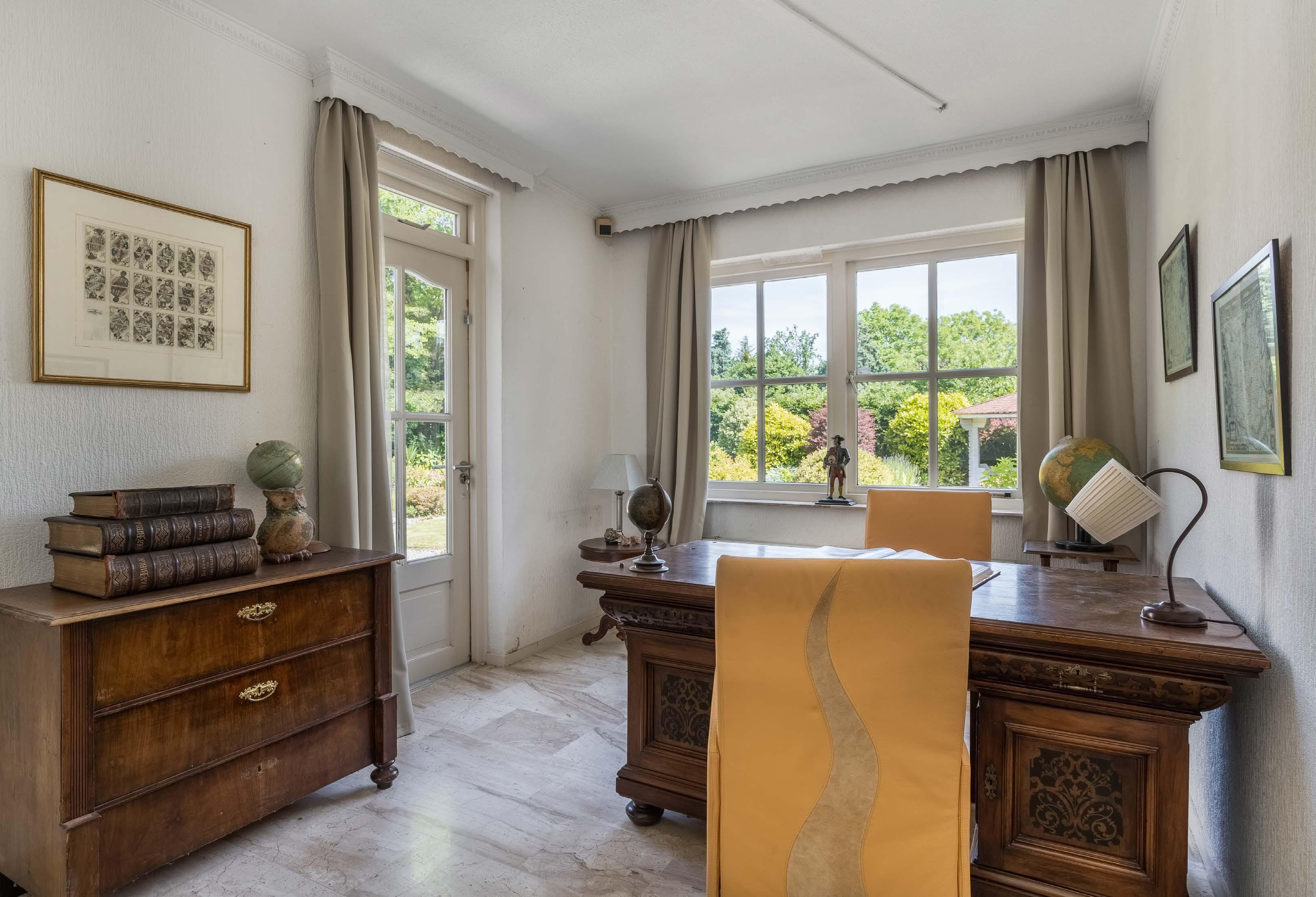 At the back left is the door to the master bedroom 1 with bathroom 1. At the back right is the door to the room that was used as an office until now. This workspace 2 has its own door to the terrace and a large window overlooking the back garden. The room is perfectly suitable as an extra bedroom, home office, playroom or TV room.