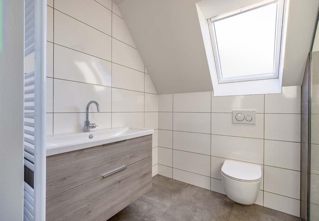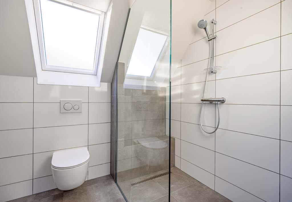 The luxurious and complete bathroom is fitted with a glass shower enclosure with thermostatic tap, a washbasin on wall unit with single-lever tap and a 2nd free-hanging toilet. The size is approximately 2.90 x 1.88 m. This modern bathroom is equipped with mechanical ventilation and natural ventilation through the Velux skylight.