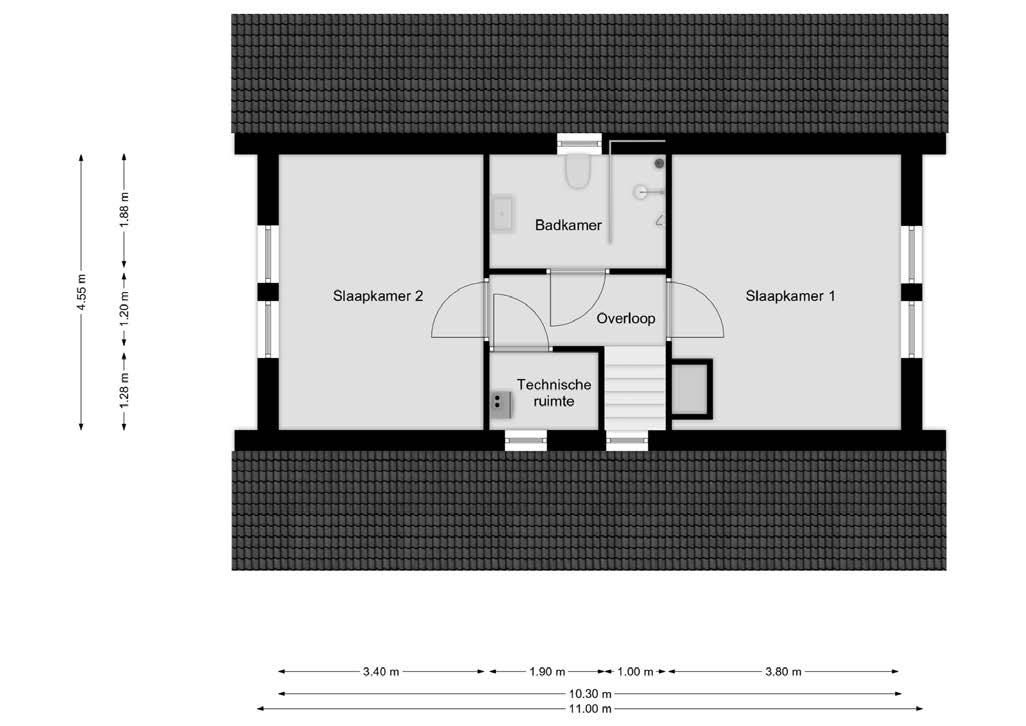 Bedroom 2 has a size of approximately 4.55 x 3.40 m and also has two windows in the other end wall.