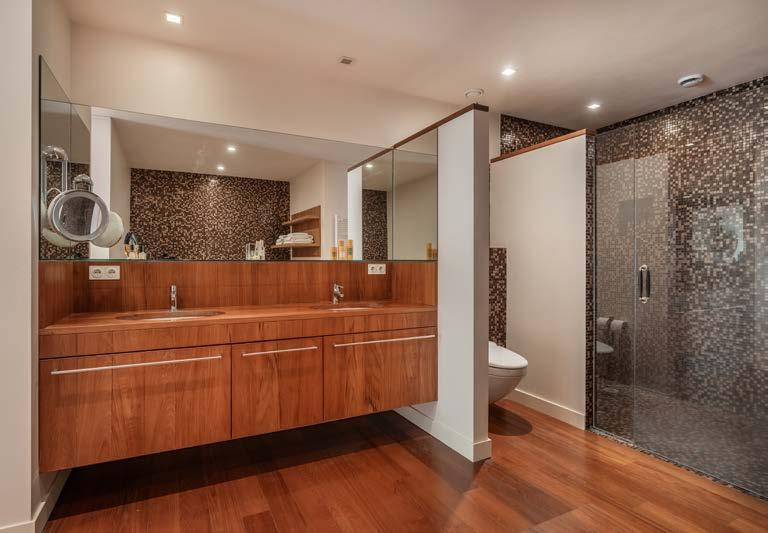 Overal zijn bovendien verfijnde en greeploze interieurs maatwerkmeubelen toegepast, die naar ontwerp van de Spaanse interieurarchitect zijn vervaardigd door een vakkundige interieurbouwer: van garderobekasten, kantoor- en boekenkasten met bibliotheekladder en inloopgarderobe-wandkasten tot de afgesloten kitchenette de luxe in het kantoor.