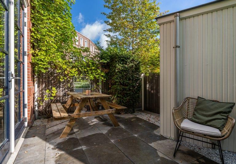 In de schuur van circa 7 m² is ruimte voor fietsen en gereedschap. Ernaast zijn het afstapje en de poort naar het afgesloten binnenterrein met de ondergrondse container voor papier. De afvalcontainer is gesitueerd aan de andere zijde van het binnenterrein.