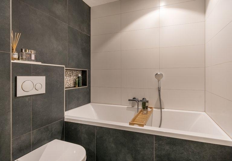 The luxurious bathroom 1 has a wide vanity unit with illuminated mirror, a walk-in shower with thermostatic tap, bathtub with thermostatic tap, a floating toilet and a toweldesign radiator.