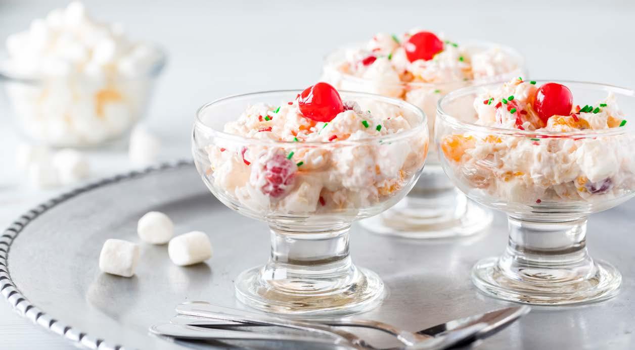 2. In a large bowl, mix together the pineapple, halved maraschino cherries, flaked coconut, and mini marshmallows until combined. Then, gently fold in the mandarin oranges.
