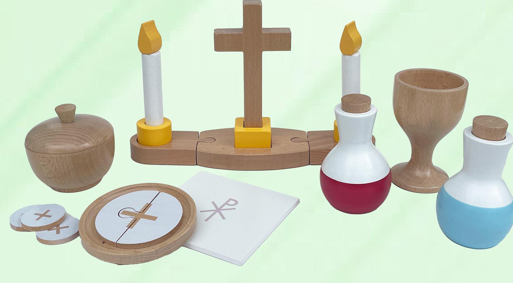 Even Pope Leo XIV played Church as a child! Playing Mass is a beautiful and effective way for children to learn about one of the most important s of their Catholic faith Includes buildable Altar piece with cross candles, wine cruet, holy water cruet, chalice, chalice pall, paten priest host, and ciborium with 6 hosts Solid wood 28 pieces orms to all ASTM standards .95