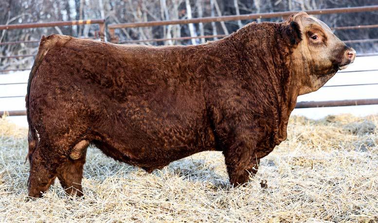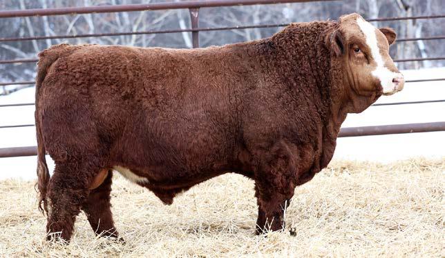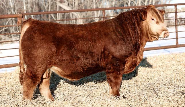 A true sale feature here. Cherry red with that awesome hair coat, super deep and soggy made, long bodied and stout with am outcross pedigree. This is a calf that a lot of people pick out when they tour the pen. His mother is a gorgeous udder Carhartt cow that would also be the grand dam of one of the really good Ease sons in the sale. She would also be a maternal sister to the heifer calf that Siroski Simmentals bought from us at Friday Night Lights in December. He was over 1000 at weaning and over 1500 at a year, he has an awesome EPD profile and he’s backed by an awesome cow. This guy checks a lot of boxes.