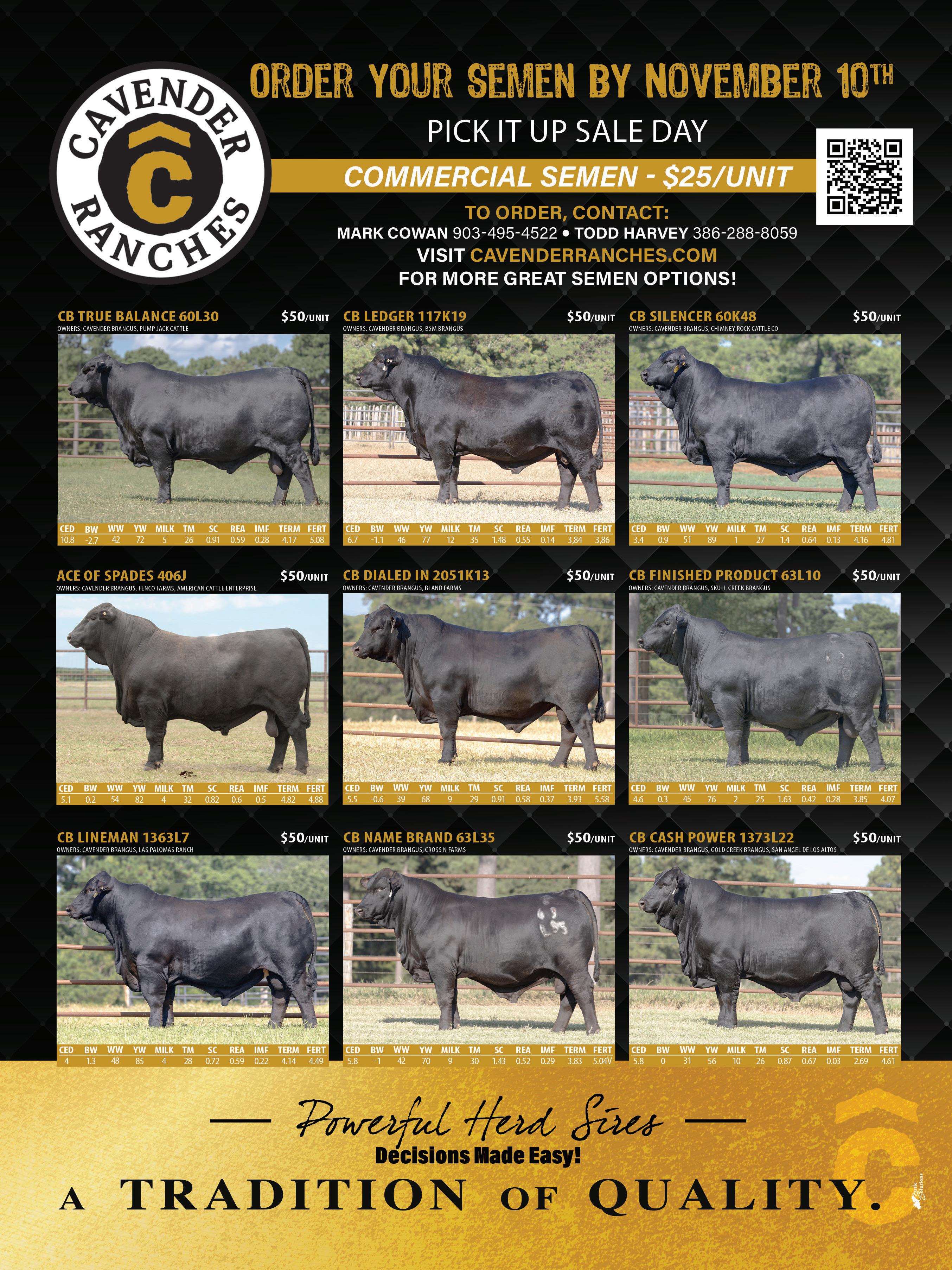 We look forward to seeing you November 14th and 15th. Come Friday for the female sales and eat a steak with us Friday night and stay for the bull sale on Saturday. If you have any questions, anything we can help you with or to preview the offering, please feel free to contact myself, Todd Harvey or any of the Cavender Ranch team.