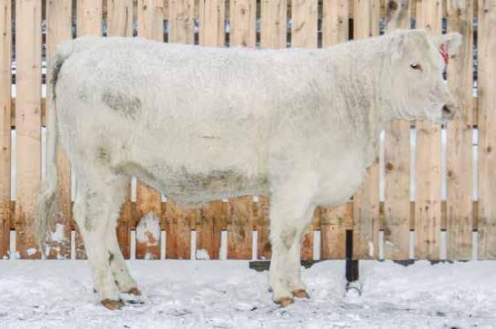 This white heifer is a sweet looking SOS Jackpot daughter from an older BarB Lady 59B cow. 59B still has good feet and udder. Should grow to be moderate size cow.
