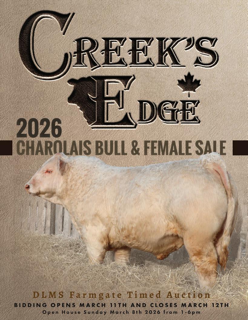 Welcome to our 2026 bull sale catalogue! WITH THE ADDITION OF PUREBRED REPLACEMENT HEIFERS! We are excited to present this great set of bulls to you! These bulls will sell on the DLMS Farmgate Timed Auction on March 11 &12th. The timed auction system is well received in the Ag industry as a whole and has proven to be a great fit for our customers. This pen of bulls is the result of a breeding program built on practical genetics, careful selection and hands-on management. They are honestly developed and managed with longevity in mind. Our goal has always been simple: to produce bulls that add value to our customers’ herds and work for them year after year. To accomplish this, our bulls need to be structurally sound, fertile, easy to handle, and they must carry all the traits needed to produce calves that top the market. The bulls in this catalogue cover all these bases.