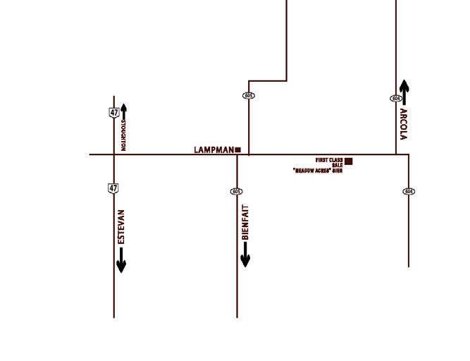 8 1/4 miles east of Lampman on highway 361, farm is south side of the highway. Turn at the “Meadow Acres” sign at laneway.