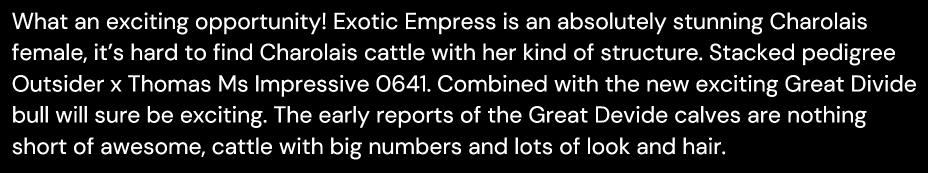Atremendous Charolais female on offer coming from outcross genetics to many herds here in Ontario!
