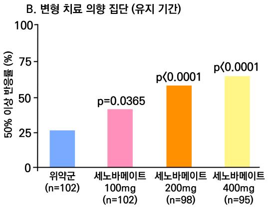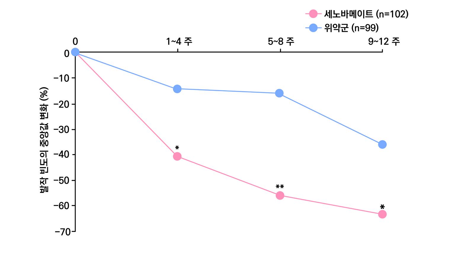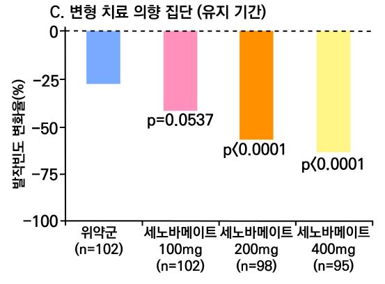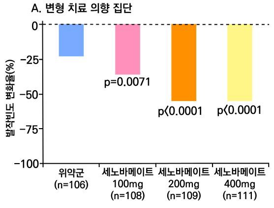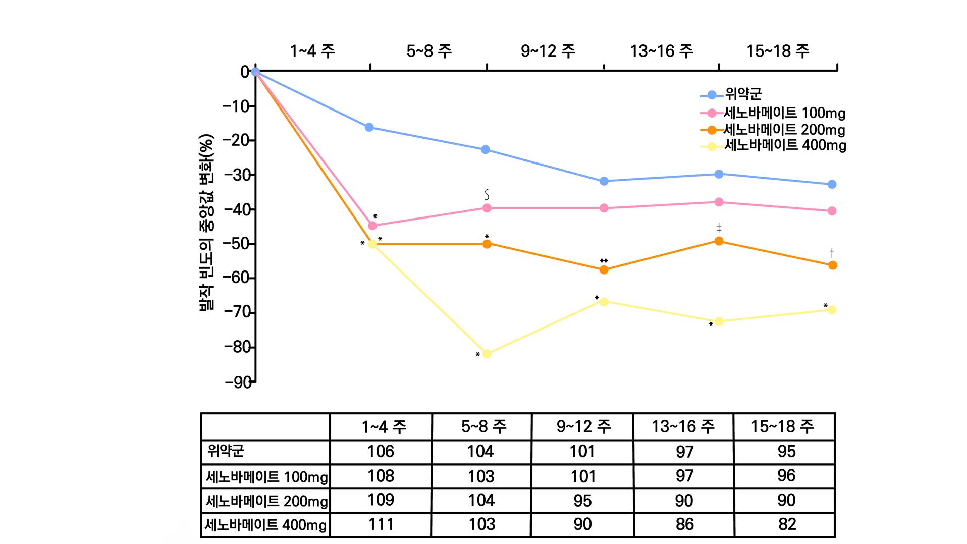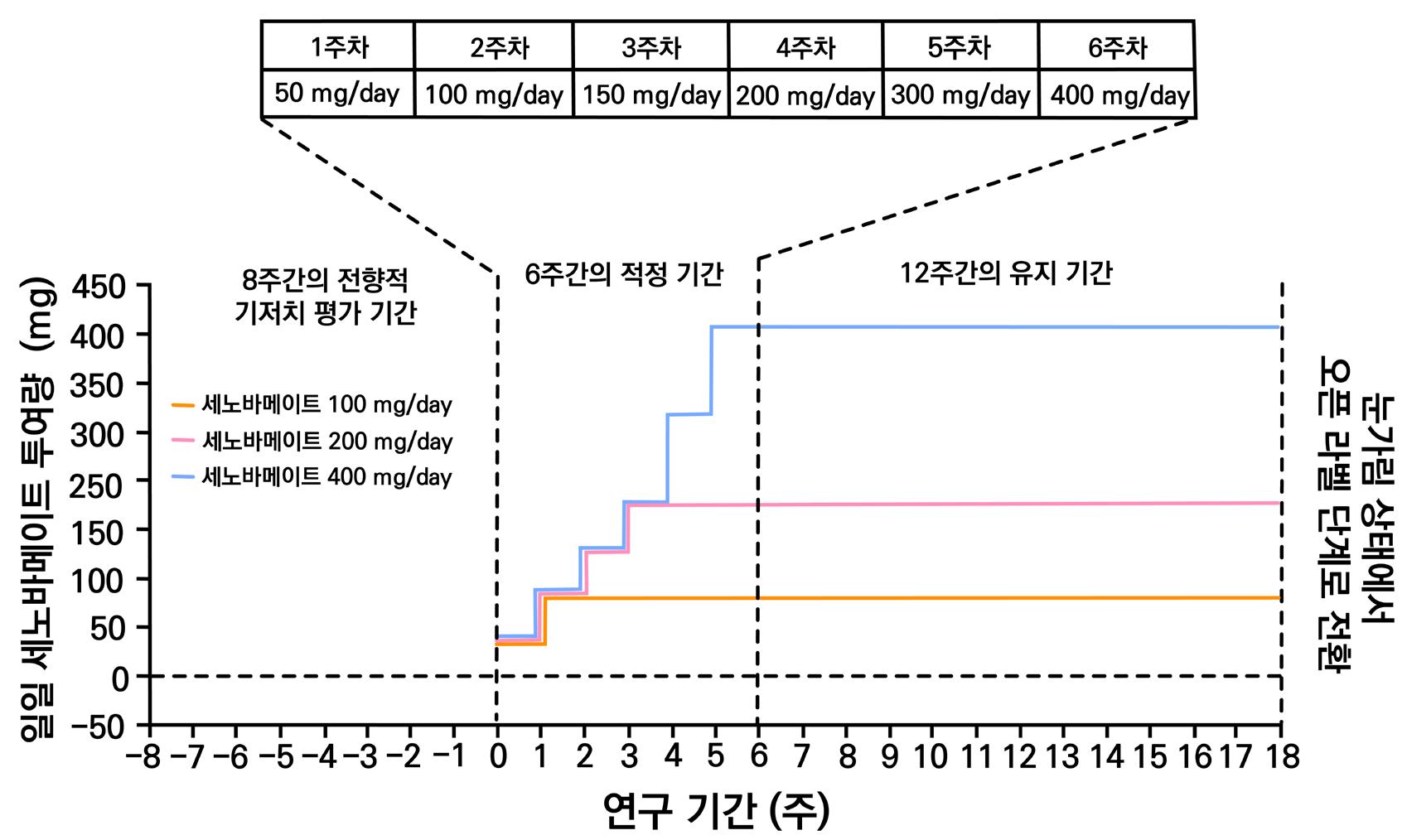 세노바메이트는 나트륨 채널 억제와 GABA_A 수용체 양성 조절 작용을 통해 부분 발작 치료 제로 승인된 약물이다. 현재 진행 중인 임상시험은 성인 및 소아 환자를 대상으로 한 용량-반