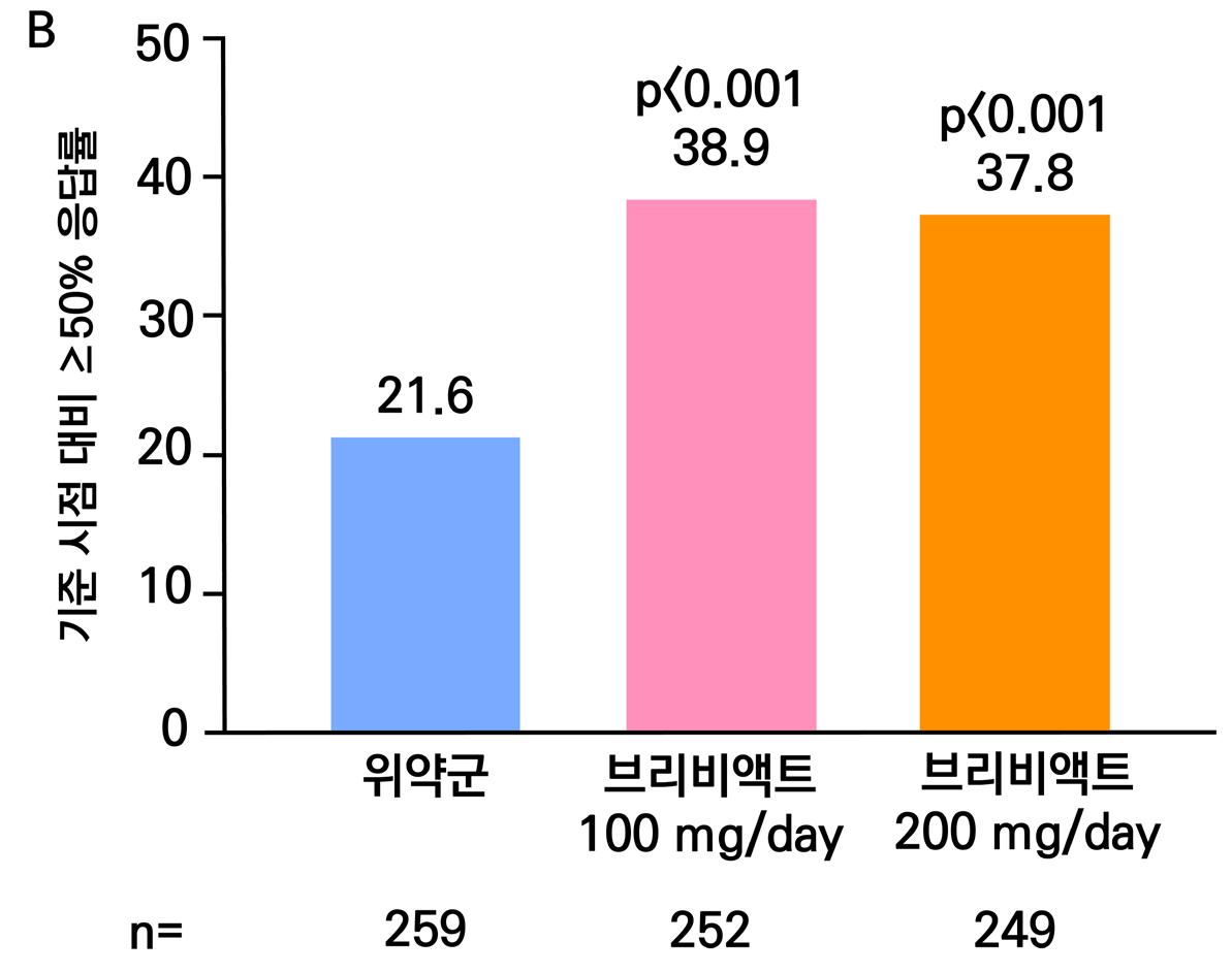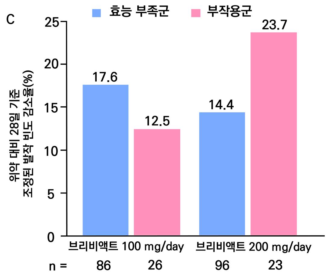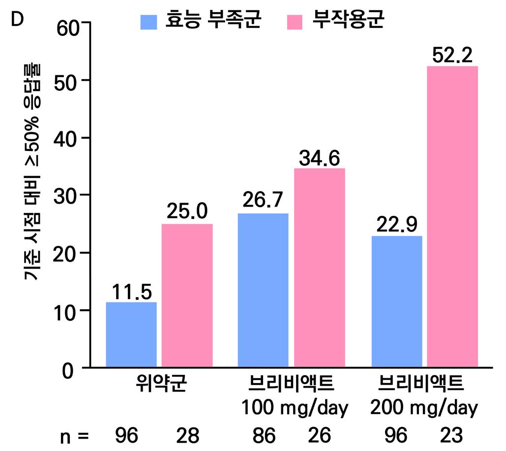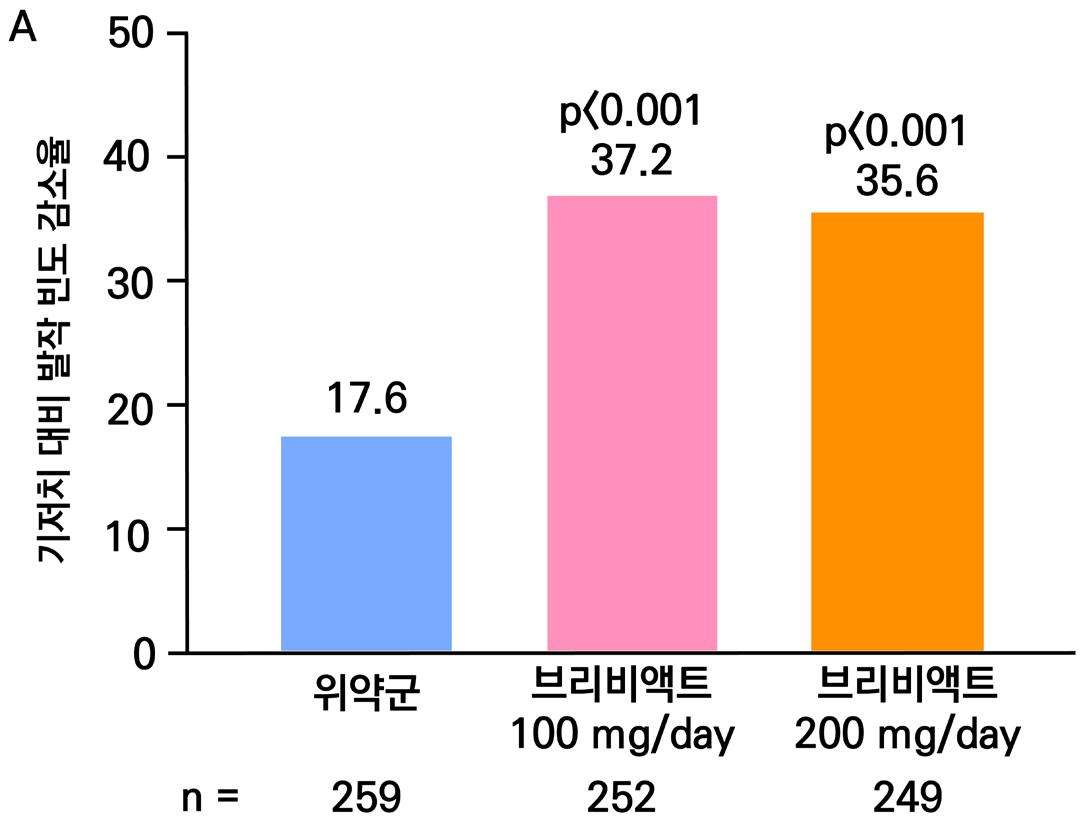 브리바라세탐은 SV2A 단백질에 선택적으로 결합하는 약물로, 레비티라세탐보다 높은 친화도 를 가진다. 특히 신경망의 과흥분을 안정화시켜 뇌전증뿐만 아니라 신경병성 통증 및 치매 관련 신경활동 조절에도 응용가능할 것으로 전망된다. 최근 연구에서는 척수 손상 환자의 신경병성 통 증 완화를 평가하는 무작위 위약 대조 연구(NCT04379011)와 알츠하이머병 환자에서 관찰되 는 해마의 과흥분성과 뇌전증적 활동에 대한 연구(NCT05899764)가 진행 중에 있다. 이로써 뇌 전증 치료제 중에서도 신경병성 통증 및 신경퇴행성 질환으로의 확장 가능성을 보여주는 대표적 인 사례로 평가된다.