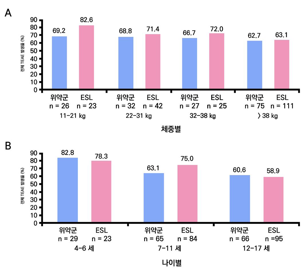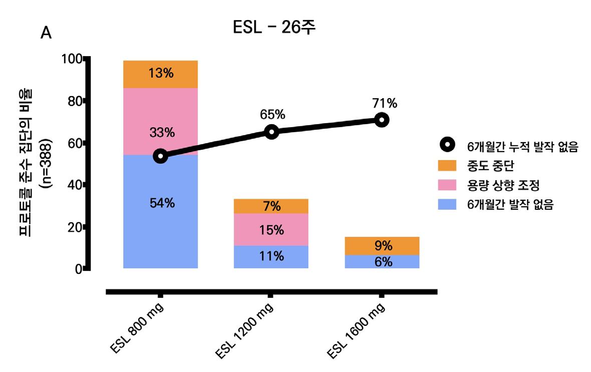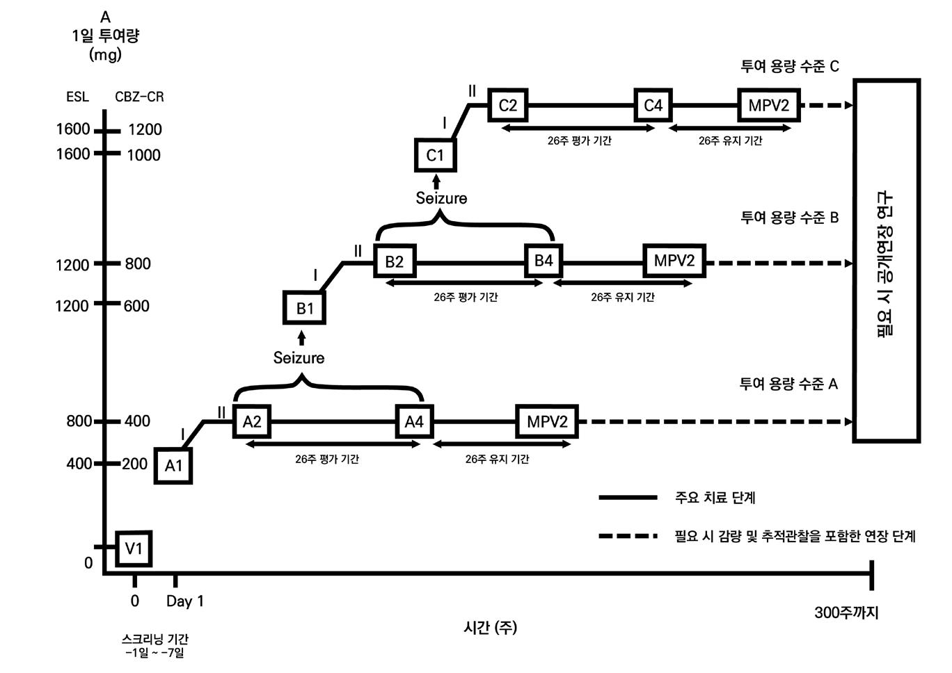 에슬리카바제핀 아세테이트는 1일 1회 복용이 가능한 서방형 정제로 승인되었으며, 제형 개발 측면에서 소아 환자를 위한 경구 현탁액 연구가 활발히 이루어졌다. 실제로 소아를 대상으로 한 임상에서 경구 현탁액의 효능과 안전성이 검증되었고(NCT00988156), 현탁액의 맛 선호도를 비교하는 연구까지 수행되었다(NCT02021461). 또한 소아의 약동학 및 장기 안전성을 확인하 는 과정에서도 현탁액 제형이 사용되었다(NCT02170064, NCT03108729). 이는 연령별 맞춤 형 제형 개발의 필요성과 가능성을 잘 보여준다.