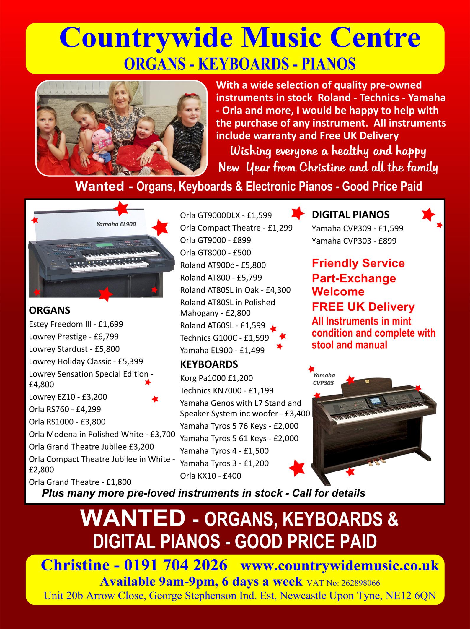 Wanted – Electric Organs bought for cash, Christine, Countrywide Music Centre, 0191 704 2026 (T)