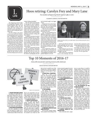 take us, but it would be nice if the football team could get it together before the matchup against Virginia Tech. 4. BASKETBALL TRANSFERS There was a week or two where the University’s basketball players were dropping like flies. There were whispers throughout Grounds about who would be leaving next and where would they be going. An underlying panic set in since basketball is arguably our best sport. So long Jarred Reuter, Marial Shayok and Darius Thompson. Good luck, and once a Wahoo, always a Wahoo. 5. 1515 OPENING This spring, 1515 University Avenue opened on the Corner as a student space to hang out, do work and get some good eats. It’s especially geared towards students that don’t want to hang out in bars on the weekends, but don’t want to stay at home either. The space used to be a bowling alley, diner, apartments, drugstore and a used book store! It’s seen a lot of history, and it is a great place to get Crumbs, play skeeball and foosball or relax with friends in the reflection room. 6. PROTESTS, PROTESTS AND MORE PROTESTS The day after Trump’s inauguration, people started taking to the
