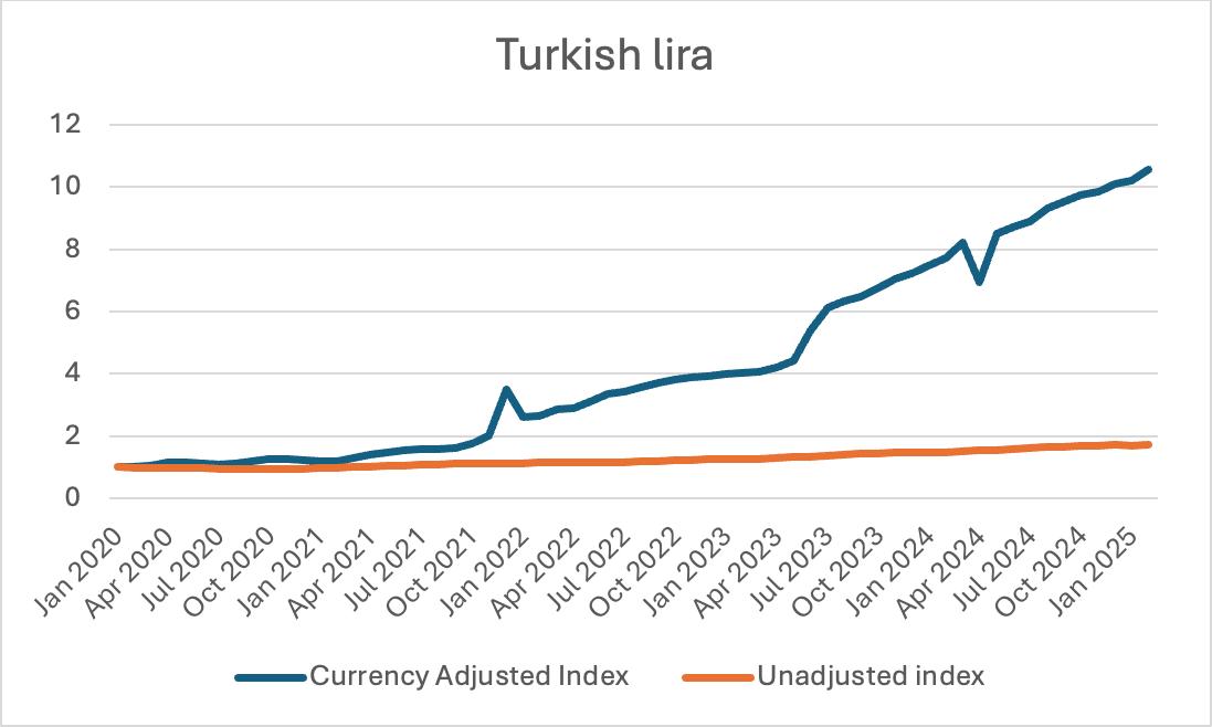 By way of methodology, the next steps are to combine the two price histories and then to standardise the results as 2020 January = 1. This produces the following currency-adjusted indices for each currency above.