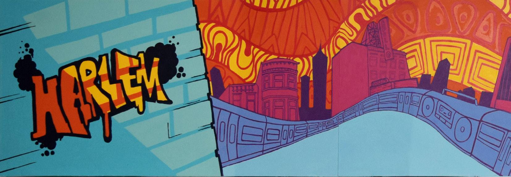 Harlem Heat was commissioned by Trader Joe’s for their new location on 125th Street in the heart of Harlem. Trader Joe’s wanted a mural by young artists that expressed the spirit and vitality of this historic neighborhood. The two sections of the mural feature prominent 125th Street landmarks, including the Apollo Theater, the Victoria Theater, the Hotel Theresa, and the Adam Clayton Powell Jr. State Office Building. Other elements include the NYC subway, a boombox, and the street sign at the intersection of Martin Luther King, Jr., Blvd. and Malcolm X. Blvd.