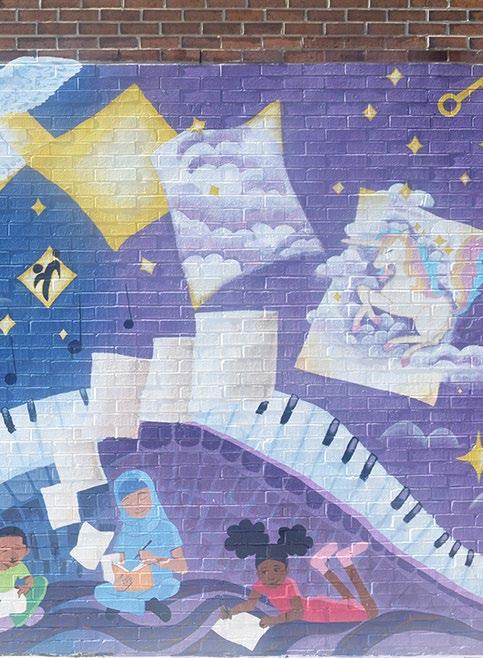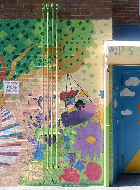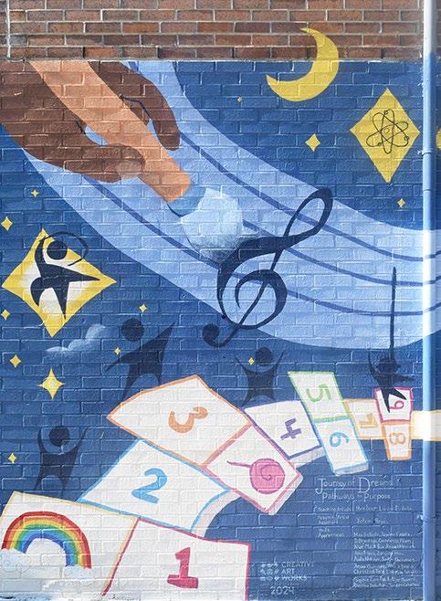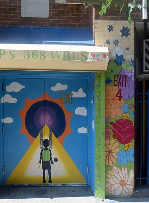 P.S. 368 / The William Lynch School asked Creative Art Works to create a mural to welcome students to school each day. Leadership at the school wanted the mural to reflect the student body. They wanted it to be youthful, hopeful, colorful, joyful, and diverse. They also wanted to encourage students to reach for their dreams. Aware that students would be passing it every day of their school career, the Youth Apprentices who collectively designed the mural filled it with “Easter eggs” that reward careful observation. We hope you find this work of art worth a second look.