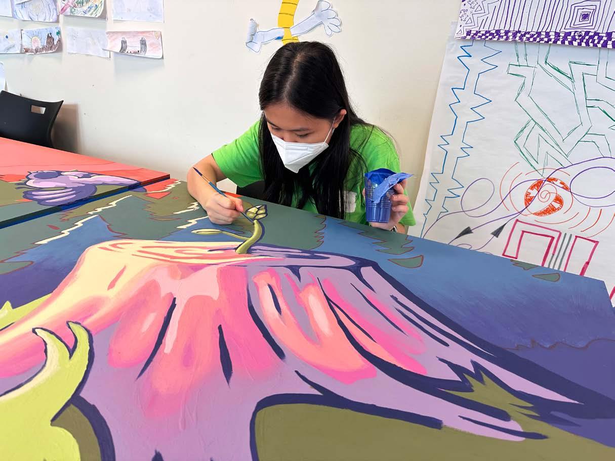 This year, our YAs painted four stunning murals or large-scale paintings. One series of panels offers hope and compassion to visitors in a waiting area at Kings County Family Court. An interior mural creates a welcoming and inclusive teen space in the Grant Houses Cornerstone Center in Morningside Heights. An expansive exterior mural at the Jacob H. Schiff Campus in West Harlem celebrates the local community. Finally, long-time supporter BXP has commissioned an abstract work for its marketing centers; the five canvases, which work together or separately, evoke the natural world and create a welcoming space.