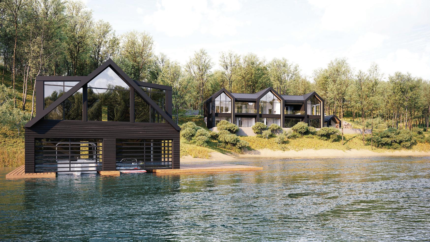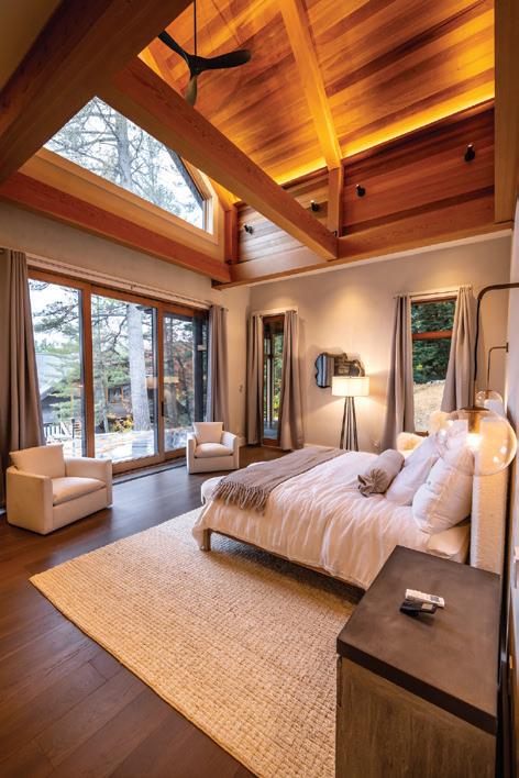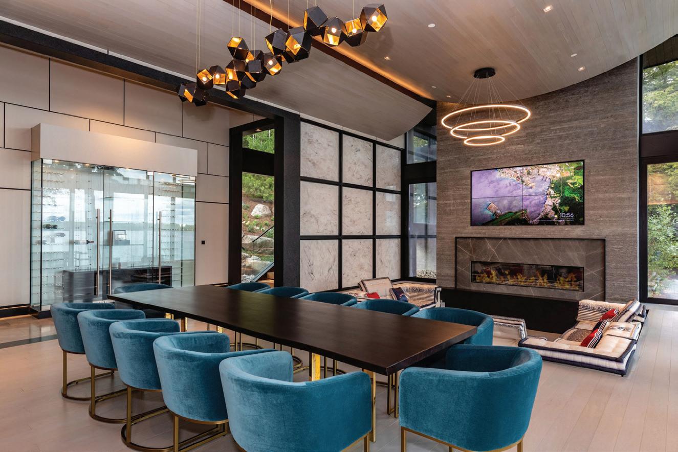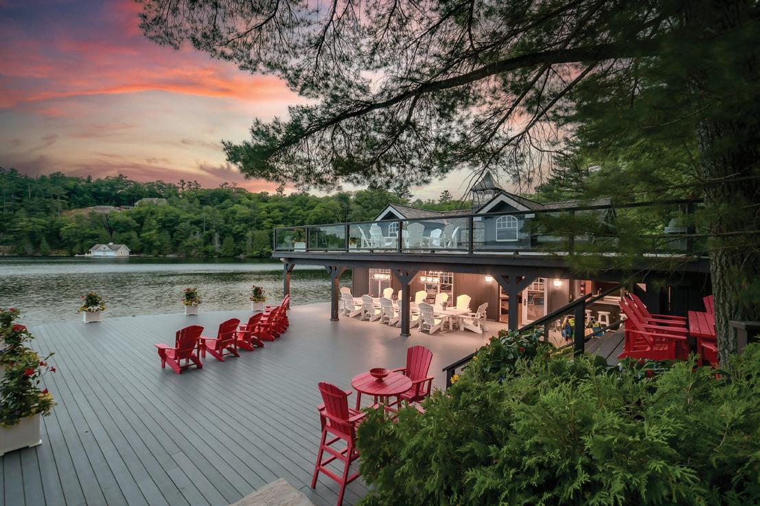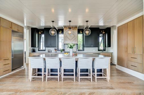 Gilbert + Burke used thermally treated ash lumber for the boathouse decking, steps, and lower deck for a natural, weatherresistant material. The boathouse features enthralling design choices, such as underwater LED lighting, clear-view glass railings, and glass garage doors that open up to the lake.
