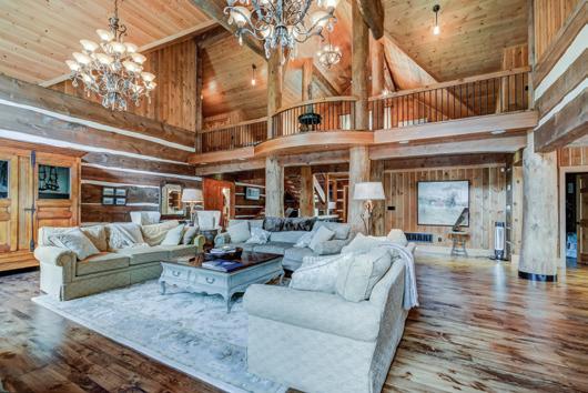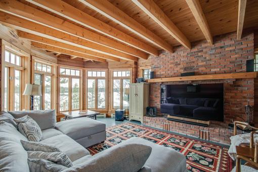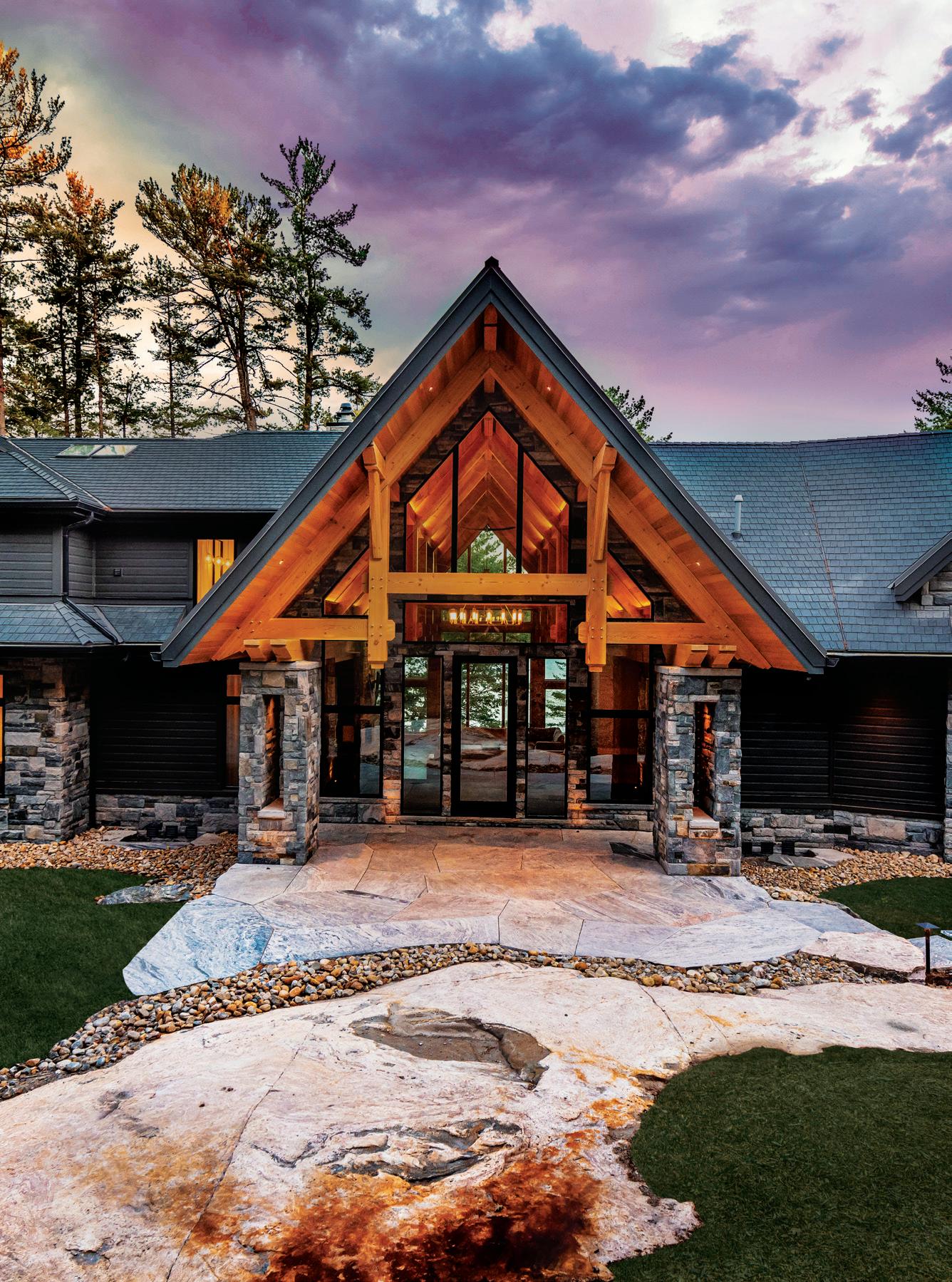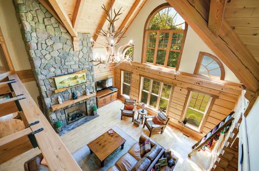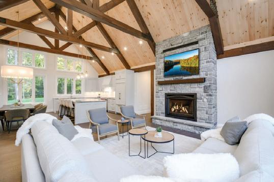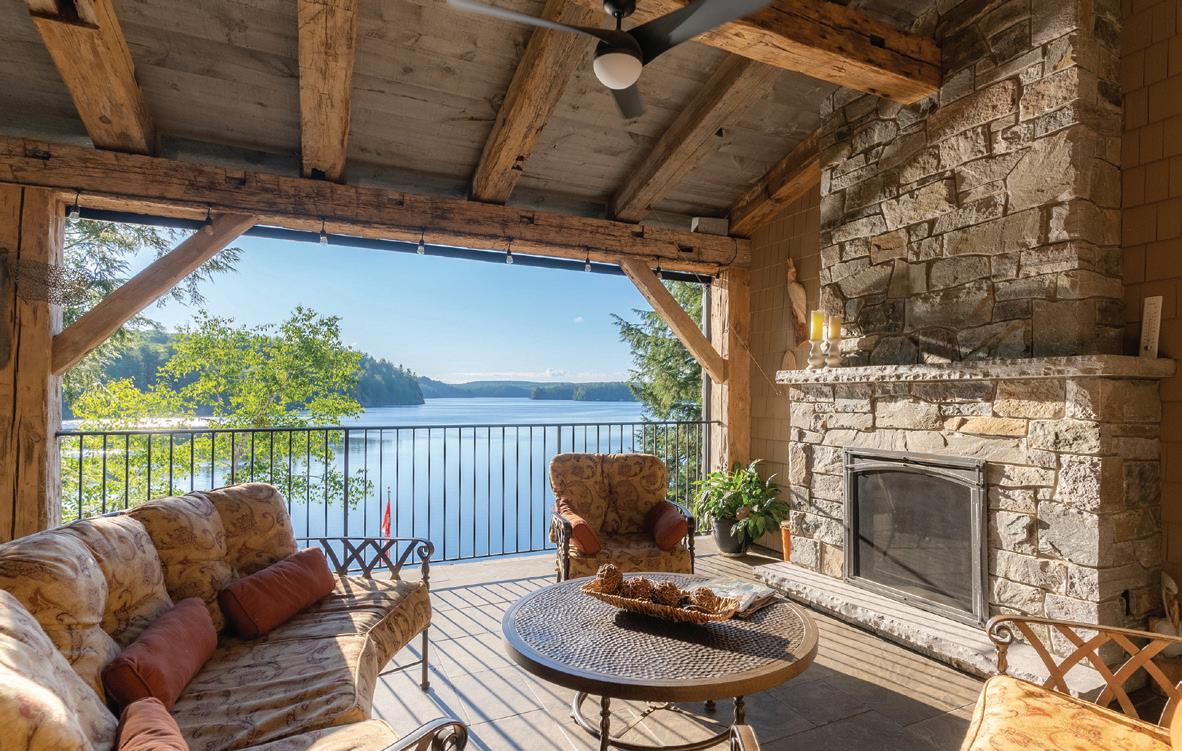 The centrepiece of the great room is a four-sided fireplace, and each octagon porch features its own fireplace. With functional timber frames, custommade furniture, and a movie room, this cottage offers a next-level experience that truly reflects a signature Peter Groza original design.