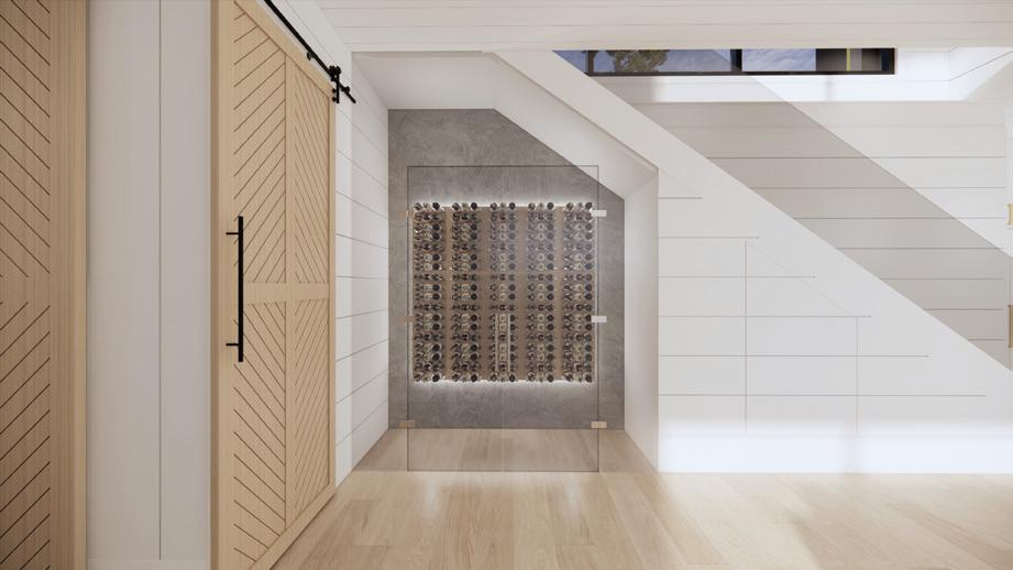 stone and wood interior creates a warm and inviting atmosphere. The custommade wine fridge and the barrelceiling entry add a touch of luxury and elegance.