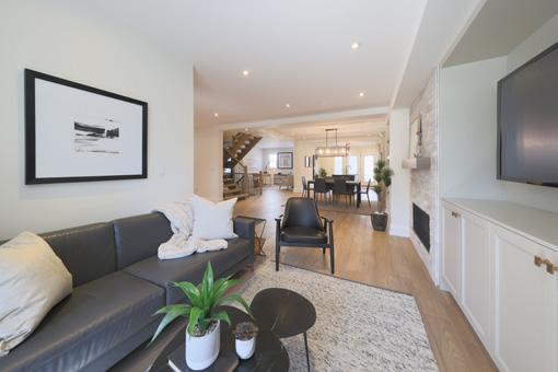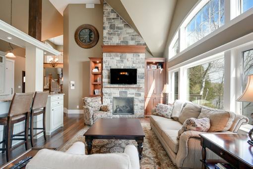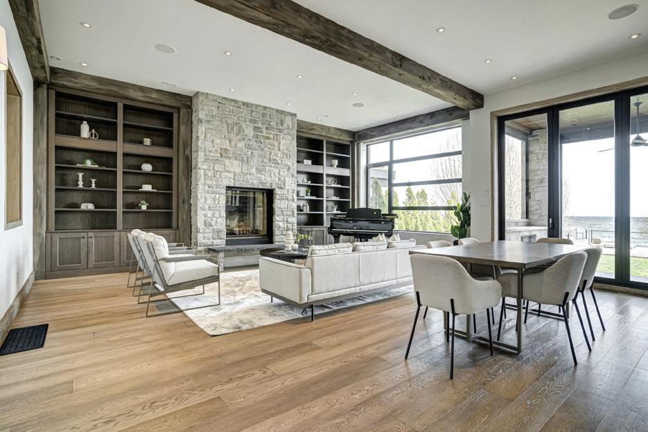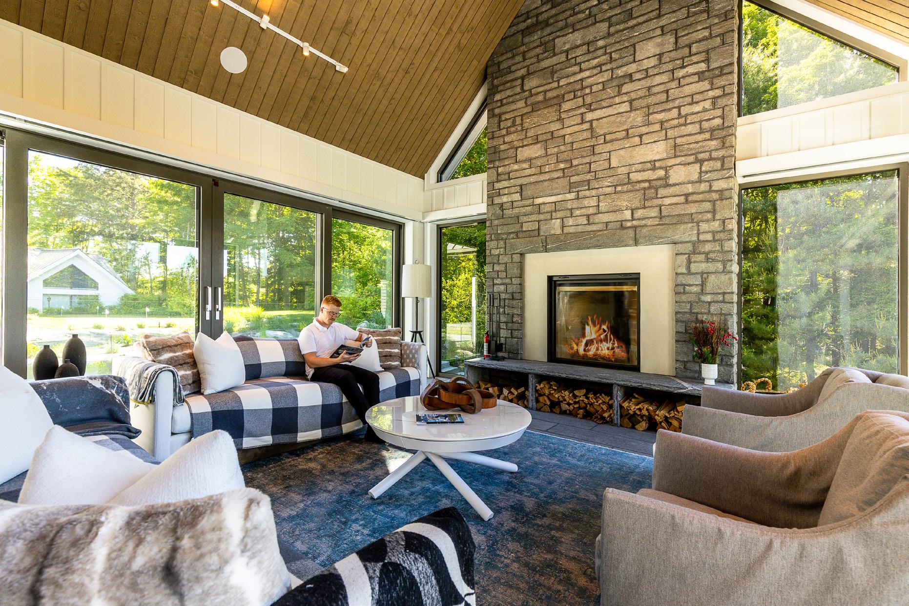 A focal point in the living room is the two-storey stone feature wall. This is also a dominant architectural element on the external facade, and houses a wood-burning fireplace and a TV. “We used natural Ontario quarried stone. It adds a depth of warmth and comfort,” Tanner explains. Two ceiling-mounted heaters radiate warmth onto the four-season sunroom, as does the in-floor heating for enjoyment year round.