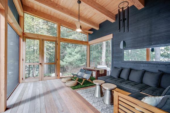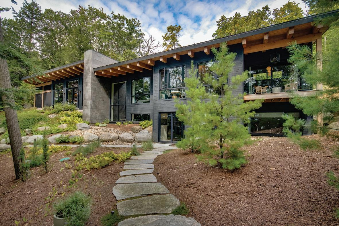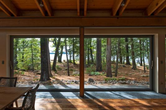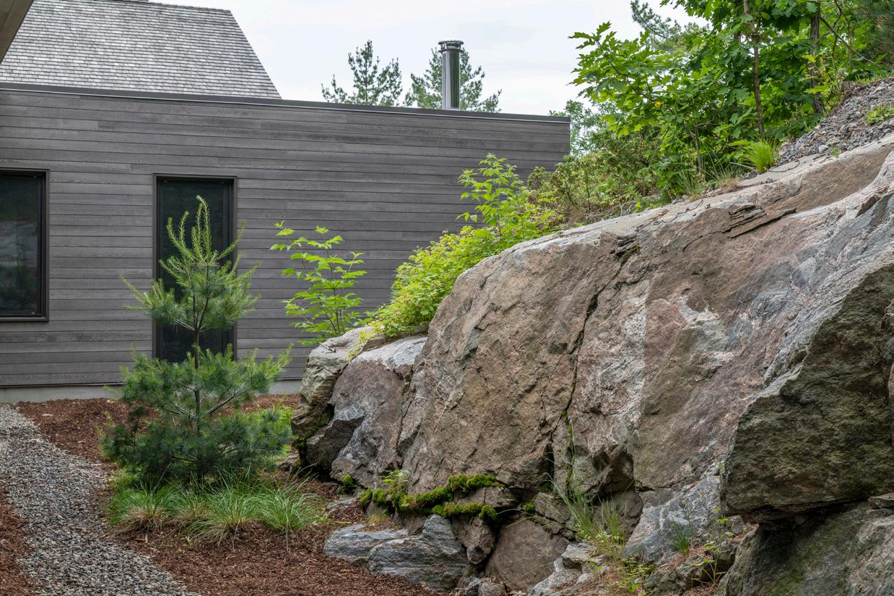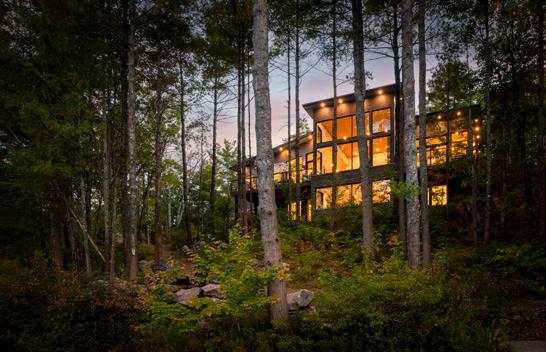 This off-grid cottage preserves mature trees through careful siting and achieves seamless indooroutdoor connectivity through sliding doors and granite detailing. Boulders and plantings restore the natural forest floor.