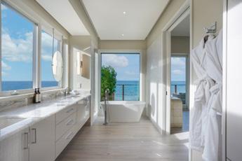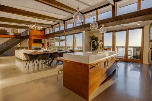 The left wing features six bedrooms, a laundry room and four bathrooms that are angled to take in the expansive water views. The division of assets, so to speak, allows for entertaining while simultaneously allowing guests to either stay up late or head to bed early and not be disturbed. “That was another driver in the overall architectural approach,” Tanner says.