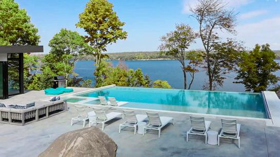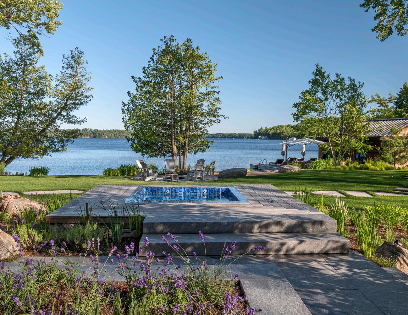 Atop an outcrop, the infinity edge pool creates a spa-like experience that stands apart from the natural landscape while providing views and reflecting the beauty of lakeside living beyond.
