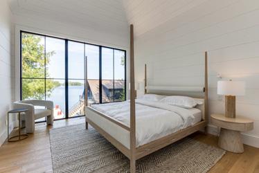 The interior features hardwood flooring throughout and is finished in neutral tones that convey a comfortable, cosy and low-maintenance vibe that invites relaxation – enjoying a cup of coffee or a glass of wine without worry. “It’s an environment of seclusion, relaxation, and the real focus on this project – and a lot of our projects – is the indoor-outdoor connectivity,” Tanner says. The intimacy of being on the water and being connected with the outdoors is key to a well-designed and well-situated cottage.