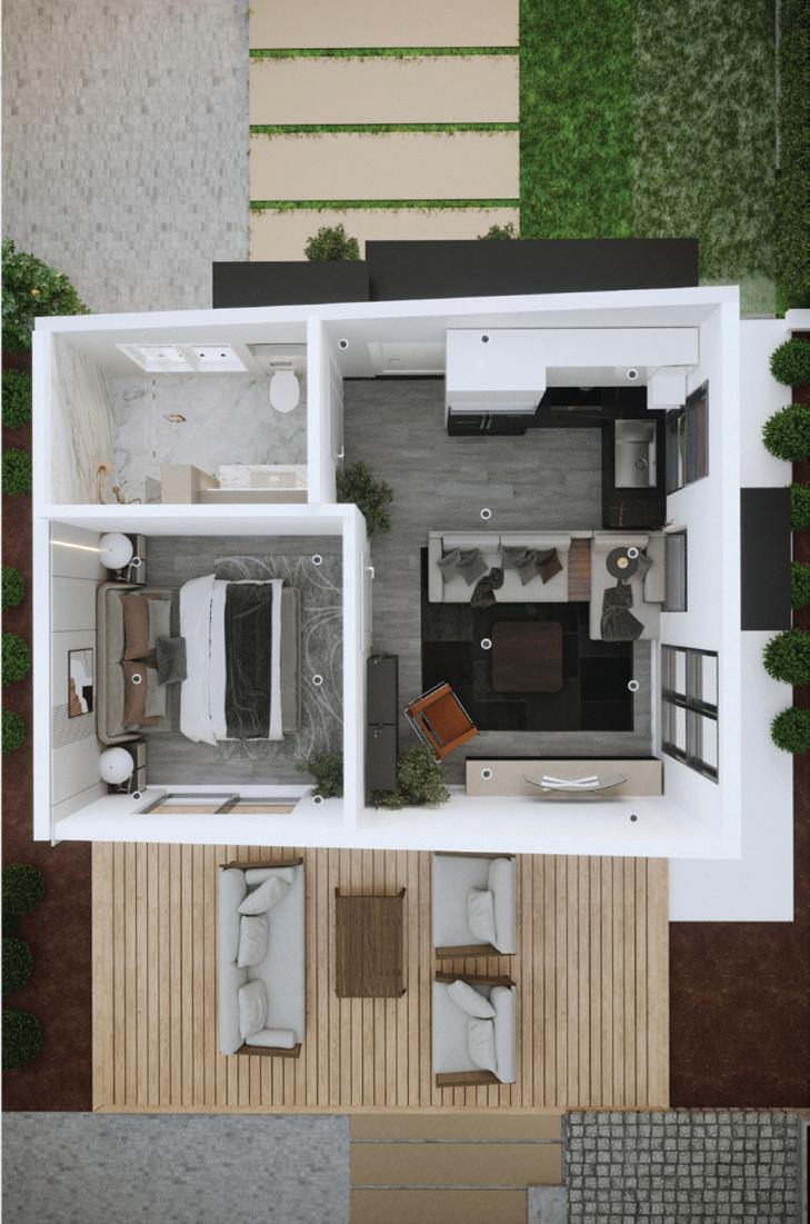 Imagine a tranquil garden suite nestled in the greenery of a backyard, designed with architectural finesse. These guest